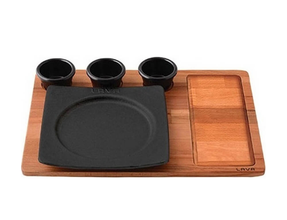 Το μαντεμένιο πιάτο της Lava είναι κατασκευασμένο από χυτοσίδηρο με εμαγιέ επίστρωση και ξύλινη βάση από ξύλο παραλίας, έχει διαστάσεις 21 x 21 εκατοστά και είναι κατάλληλο για 1 άτομο.