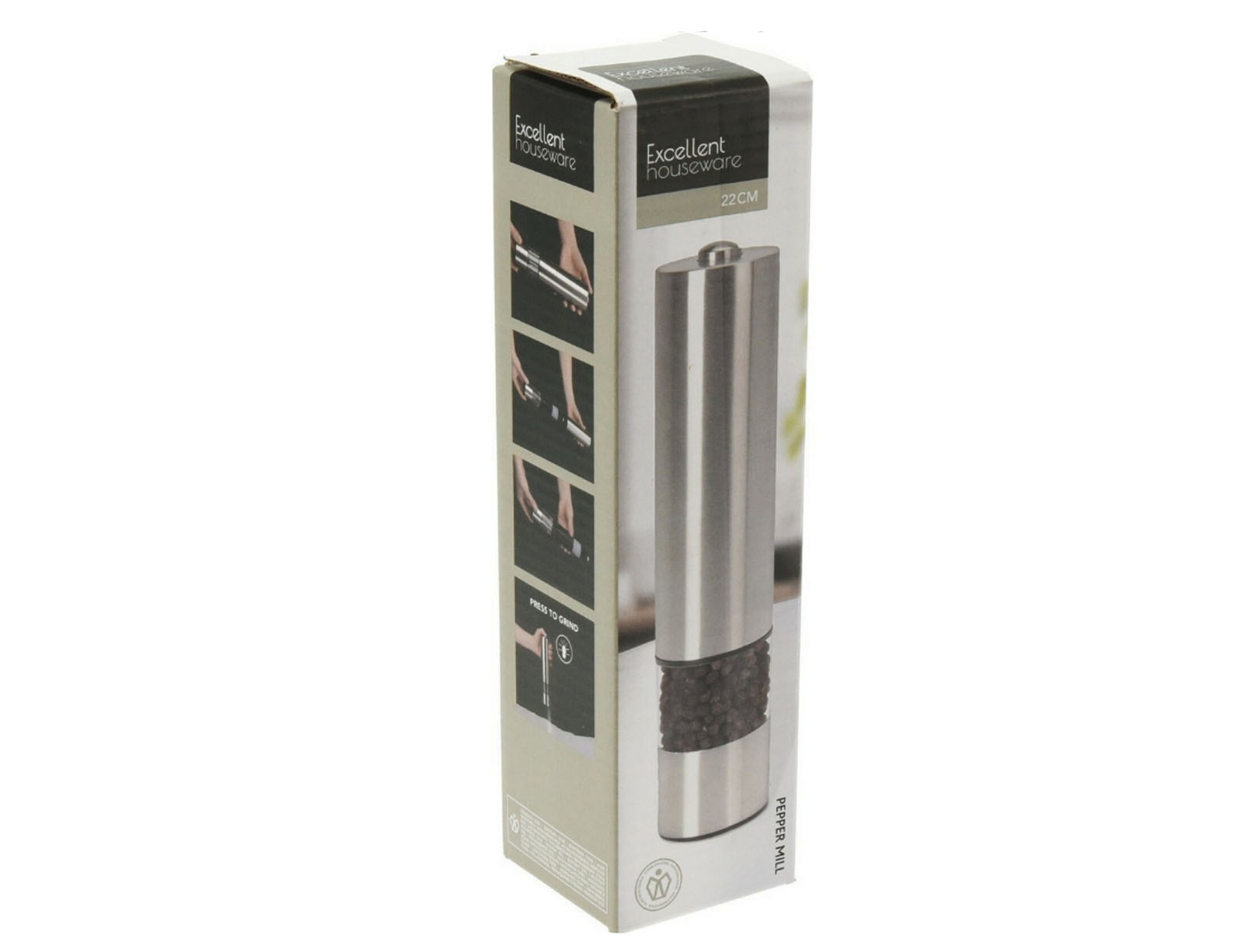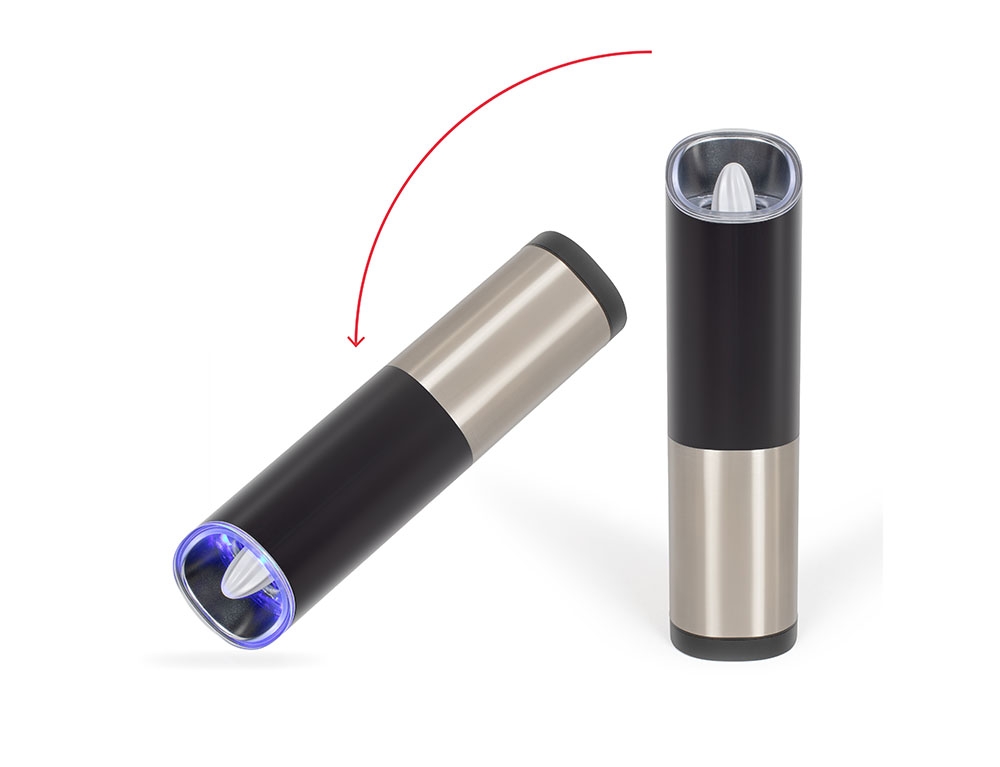 Ηλεκτρικός μύλος μπαχαρικών, αλατιού, πιπεριού με μπαταρίες, φτιαγμένος από ανοξείδωτο ατσάλι και πλαστικό με κεραμικό μηχανισμό άλεσης που μπορεί να προσαρμοστεί, περιστροφή 180° και καπάκι που συλλέγει τα υπολείμματα από το μπαχάρι.