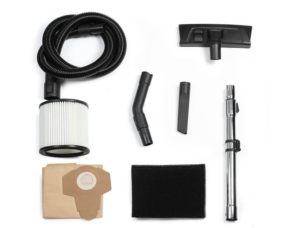 - Παραδίδεται με 1 φίλτρο HEPA, ένα φίλτρο σφουγγαριών για αναρρόφηση νερού, 2 χάρτινες σακούλες για λεπτή σκόνη και 2 ακροφύσια αναρρόφησης