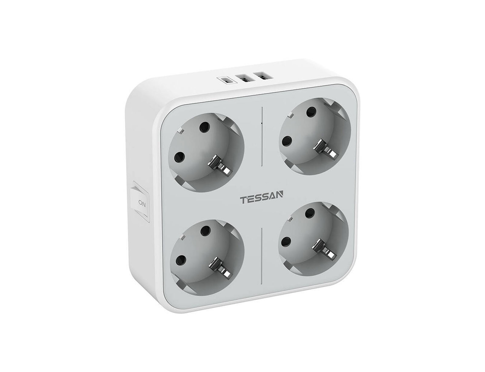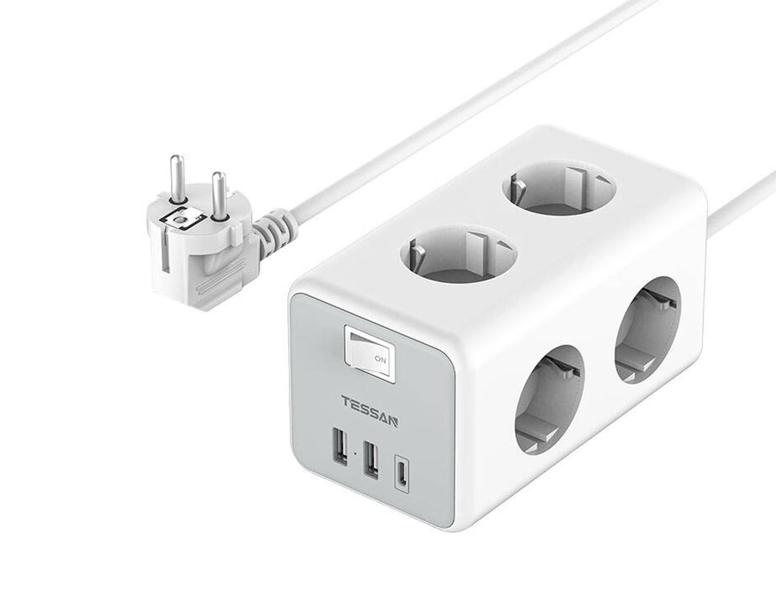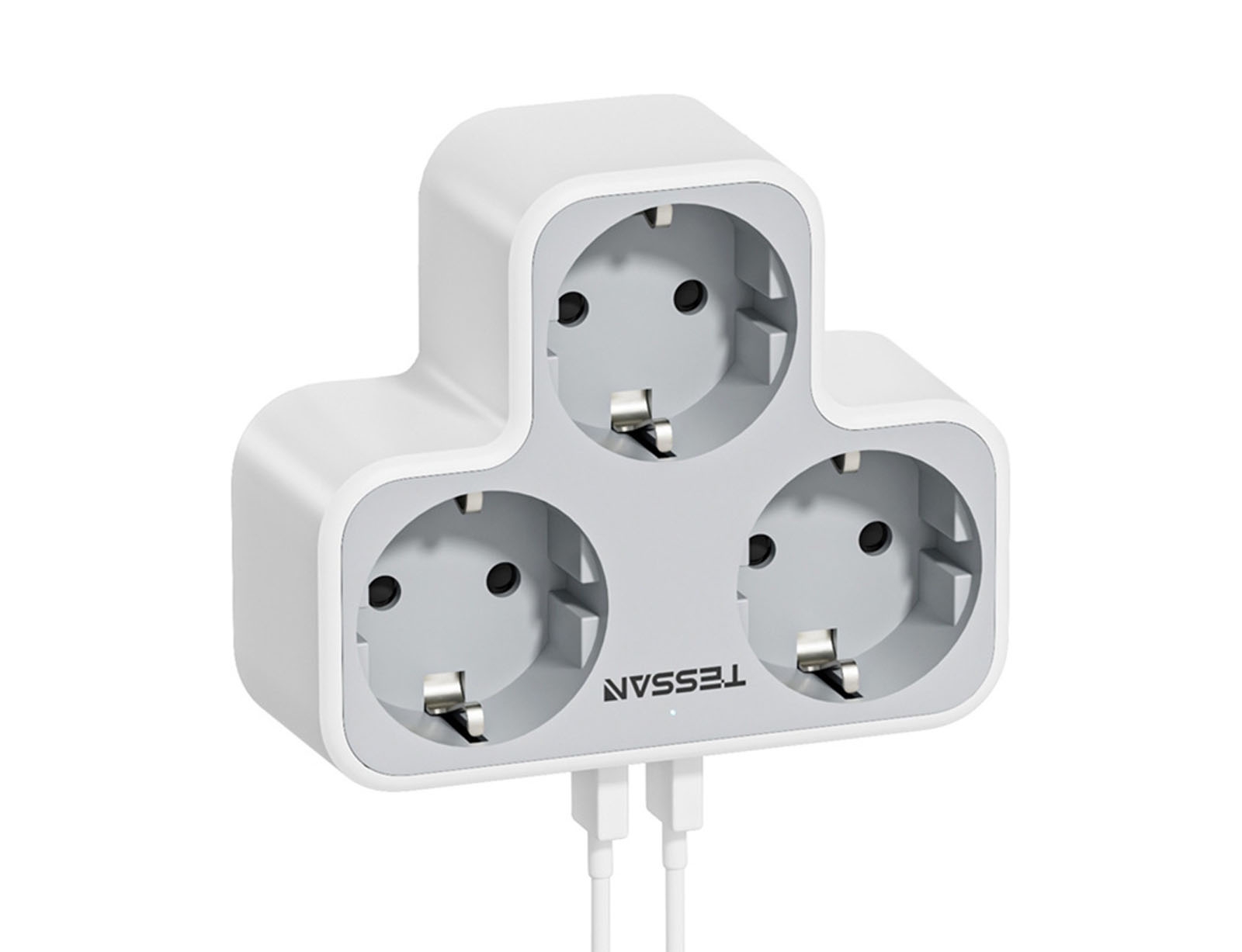 Πολύπριζο Tessan TS-301-C-GR με διακόπτη On/Off - 3x Schuko, 2x USB-A, 1x USB-C - Καλώδιο 2m - Λευκό