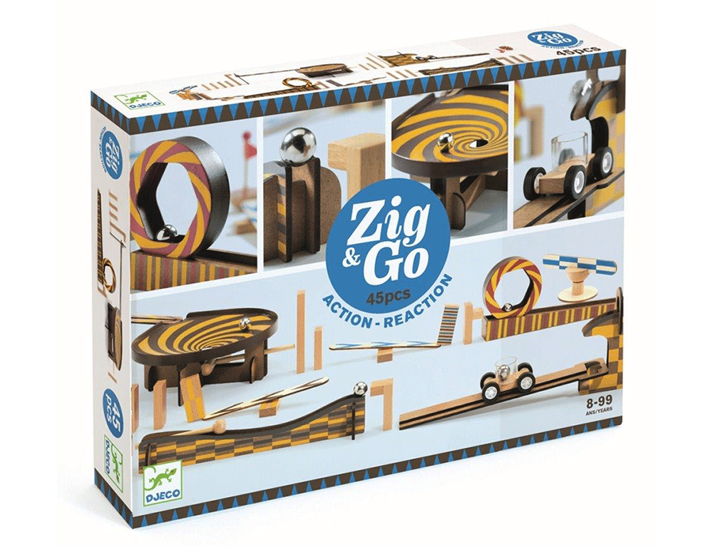 Η σειρά ντόμινο της εταιρίας Djeco ήρθε για να συναρπάσει! Το zig & go με τα 45 τεμάχια είναι ένα δημιουργικό παιχνίδι κατασκευής κατάλληλο για παιδιά ηλικίας 8 και άνω. Το παιχνίδι μέσα από το ιδιαίτερο σχεδιασμό του συνδυάζει εκπαίδευση και διασκέδαση. Το παιδί δημιουργεί, χρησιμοποιώντας τη φαντασία του ή με τη βοήθεια του βιβλίου που περιέχεται μέσα, διαδρομές στις οποίες παρατηρεί και κατανοεί τη διαφορετική ταχύτητα που αναπτύσσεται ανάλογα με το μέγεθος και τον όγκο ενός αντικειμένου, την απόσταση μεταξύ δύο αντικειμένων και πως η διακύμανση της προκαλεί διαφορετικά αποτελέσματα καθώς και τη λογική της αλυσιδωτής αντίδρασης. Παράλληλα διασκεδάζει παρατηρώντας τη διαδρομή του να γκρεμίζεται ομοιόμορφα με το πέρας της μπίλιας.