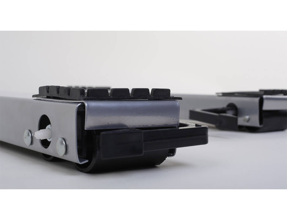 Σύστημα τροχών στο κάτω μέρος της βάσης, μετακινεί τις συσκευές προς τα εμπρός ή προς τα πίσω, με μια κίνηση! Τραβήξτε τις χειρολαβές προς επάνω (κάθετα) για να κατέβουν οι τροχοί και να μετακινήσετε τη συσκευή στην επιθυμητή θέση. Επαναφέρετε τις χειρολαβές στην αρχική θέση (οριζόντια) για να ακινητοποιήσετε τη συσκευή.