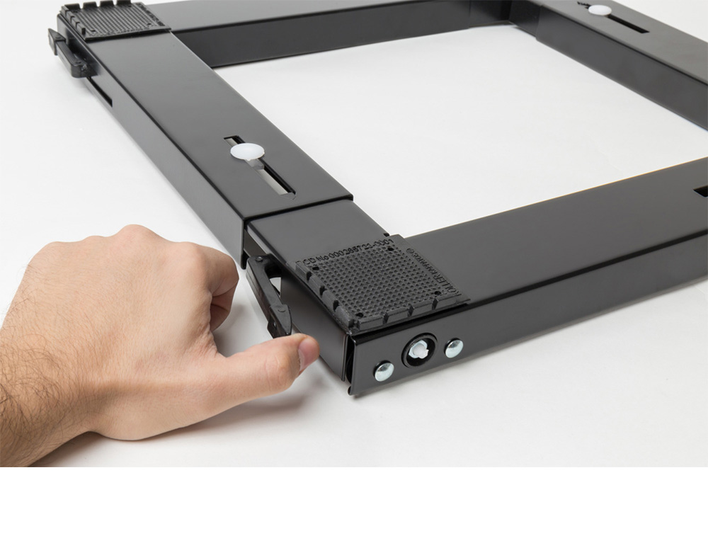 Σύστημα τροχών στο κάτω μέρος της βάσης, μετακινεί τις συσκευές προς τα εμπρός ή προς τα πίσω χωρίς κόπο! Πιέστε τις χειρολαβές προς τα μέσα για να μετακινήσετε τη συσκευή στην επιθυμητή θέση. Αντίθετα, τραβήξτε τις προς τα έξω για να “κλειδώσουν” οι τροχοί και να ακινητοποιήσετε τη συσκευή.