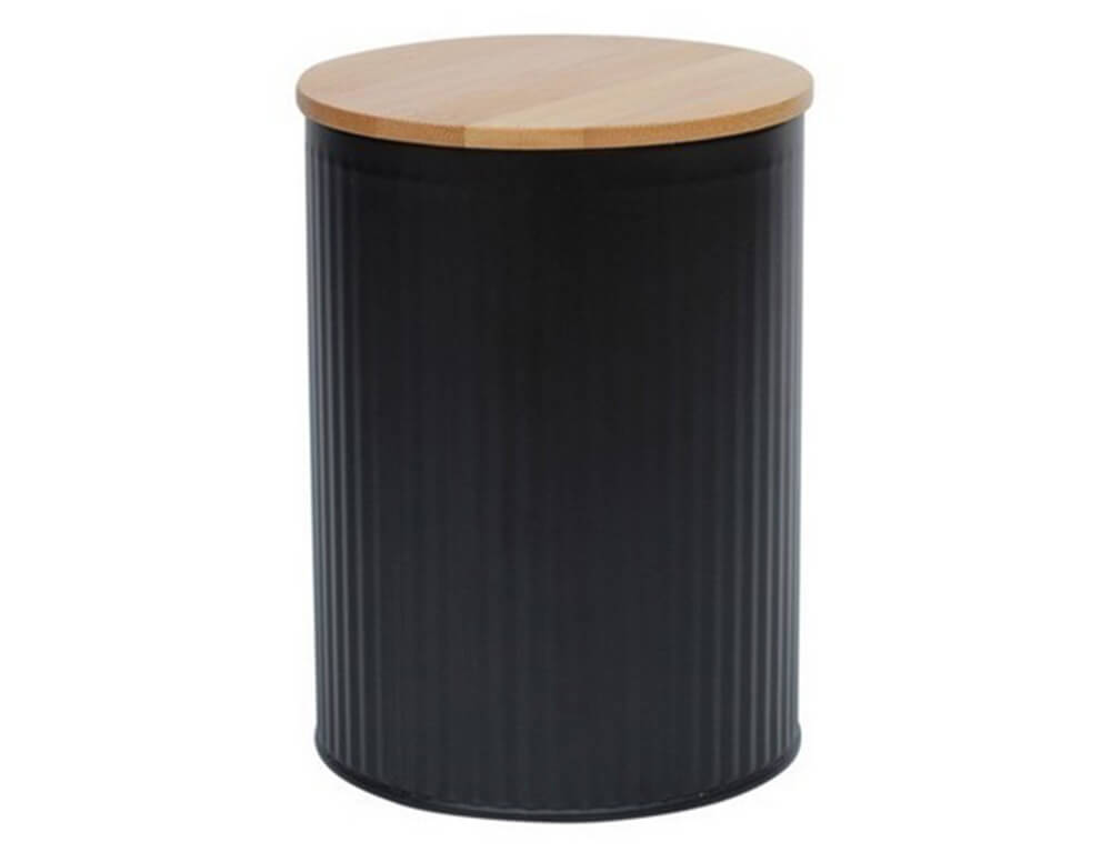 Δοχείο κουζίνας από μέταλλο υψηλής ποιότητας, εξοπλισμένο με καπάκι από μπαμπού. Πρακτικό και κομψό, σε μαύρο χρώμα. Ιδανικό για την αποθήκευση προϊόντων και ως διακοσμητικό στοιχείο της κουζίνας σας.