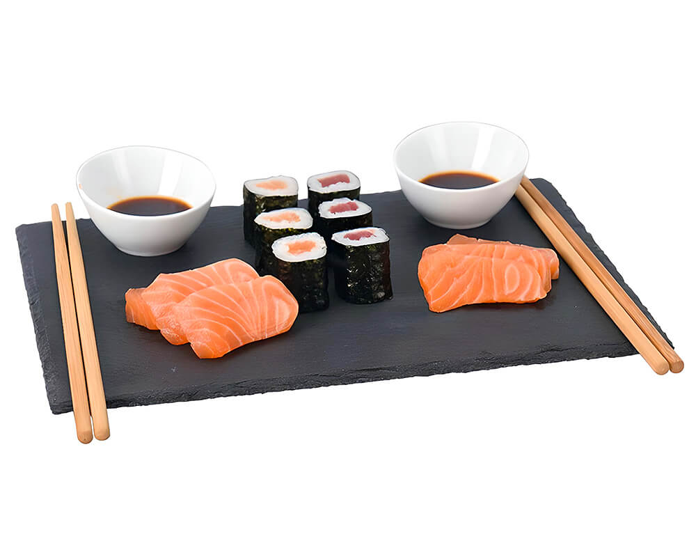 Αυθεντικό σετ για το σερβίρισμα σούσι σε βάση από σχιστόλιθο. Ιδανικό για οικογενειακές, οικιακές συναντήσεις στο τραπέζι. 2 πορσελάνινα μπολ (7 X 3 cm), 2 chopsticks μπαμπού (μήκος 24 cm) πέτρινη βάση (30 x 20 cm)