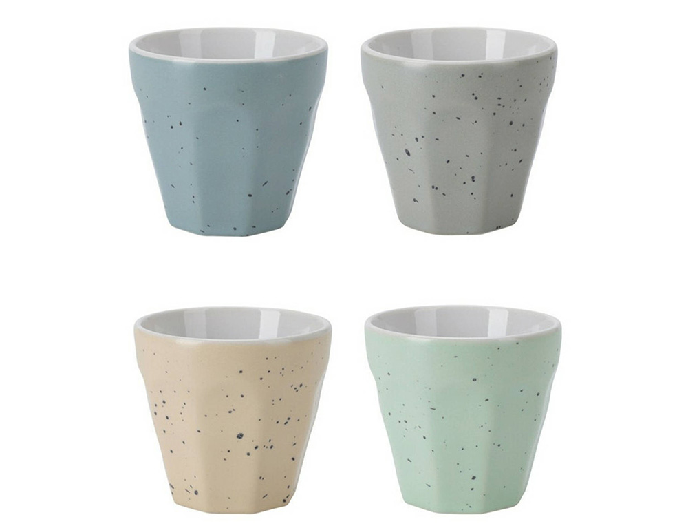 Σετ 4x τεμαχίων από μικρά πολυτελή χρωματιστά φλιτζάνια/φλιτζάνια καφέ. Αυτό το σετ αποτελείται από 4 διαφορετικά μοντέρνα χρωματιστά ποτήρια από πορσελάνη με ματ φινίρισμα και κουκκίδες. Χρώματα: μπεζ, πράσινο, μπλε, ανοιχτό γκρι