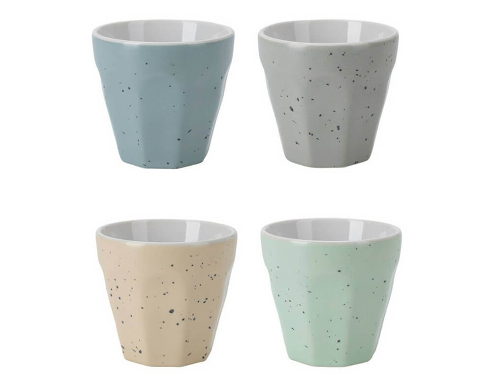 Σετ 4x τεμαχίων από μικρά πολυτελή χρωματιστά φλιτζάνια/φλιτζάνια καφέ. Αυτό το σετ αποτελείται από 4 διαφορετικά μοντέρνα χρωματιστά ποτήρια από πορσελάνη με ματ φινίρισμα και κουκκίδες. Χρώματα: μπεζ, πράσινο, μπλε, ανοιχτό γκρι