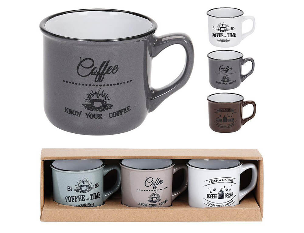 Ένα σετ από τρεις διακοσμημένες κούπες σε συσκευασία δώρου. Κάθε μία χωρητικότητας 100 ml. Κατασκευασμένη από υψηλής ποιότητας κεραμικό. Ιδανική για καφέ τύπου εσπρέσο. Ιδανικές για χρήση στον φούρνο μικροκυμάτων και το πλυντήριο πιάτων. 3 ποικίλα χρώματα με σχέδια