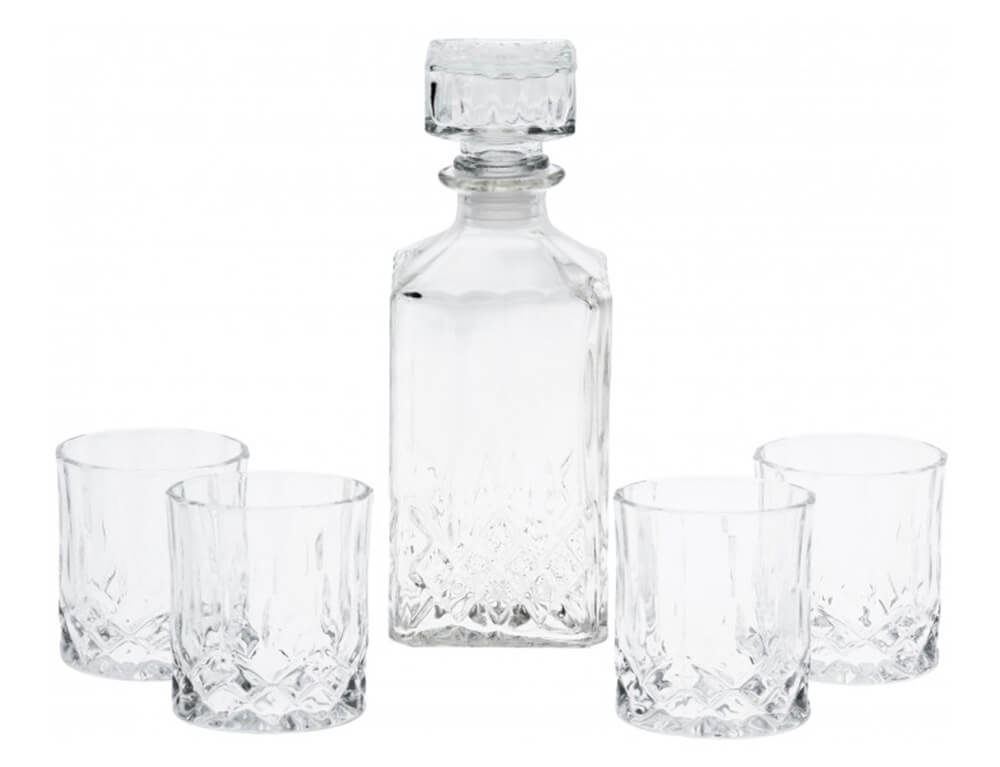 Πολύ κομψό σετ για σερβίρισμα ποτών. Το σετ αποτελείται από καράφα και 4 ποτήρια. Το σύνολο είναι κατασκευασμένο από κρυστάλλινο γυαλί. Η καράφα είναι εξοπλισμένη με φελλό. Χάρη σε αυτό, το αλκοόλ που έχει μείνει στο καράφα δεν θα χάσει τη γεύση του. Ιδανικό για σερβίρισμα ουίσκι και άλλων ειδών ποτών. Ένα τέτοιο σετ θα είναι μια κομψή διακόσμηση του καθιστικού. Χωρητικότητα καραφιού: 900 ml Διαστάσεις καραφιού: 23x9x9 cm