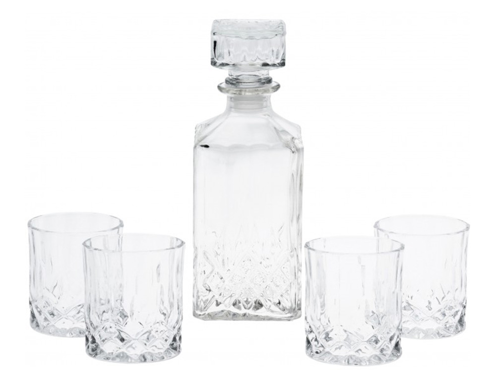 Πολύ κομψό σετ για σερβίρισμα ποτών. Το σετ αποτελείται από καράφα και 4 ποτήρια. Το σύνολο είναι κατασκευασμένο από κρυστάλλινο γυαλί. Η καράφα είναι εξοπλισμένη με φελλό. Χάρη σε αυτό, το αλκοόλ που έχει μείνει στο καράφα δεν θα χάσει τη γεύση του. Ιδανικό για σερβίρισμα ουίσκι και άλλων ειδών ποτών. Ένα τέτοιο σετ θα είναι μια κομψή διακόσμηση του καθιστικού. Χωρητικότητα καραφιού: 900 ml Διαστάσεις καραφιού: 23x9x9 cm