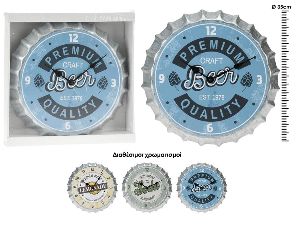 Ρολόι τοίχου VIBES σε σχέδιο καπάκι μπουκαλιού Y36200690 Μεταλλικό καντράν, Διάμετρος 35 cm, σε 3 επιλογές χρώματος - σχεδίου, λεμονάδα/σόδα/μπύρα