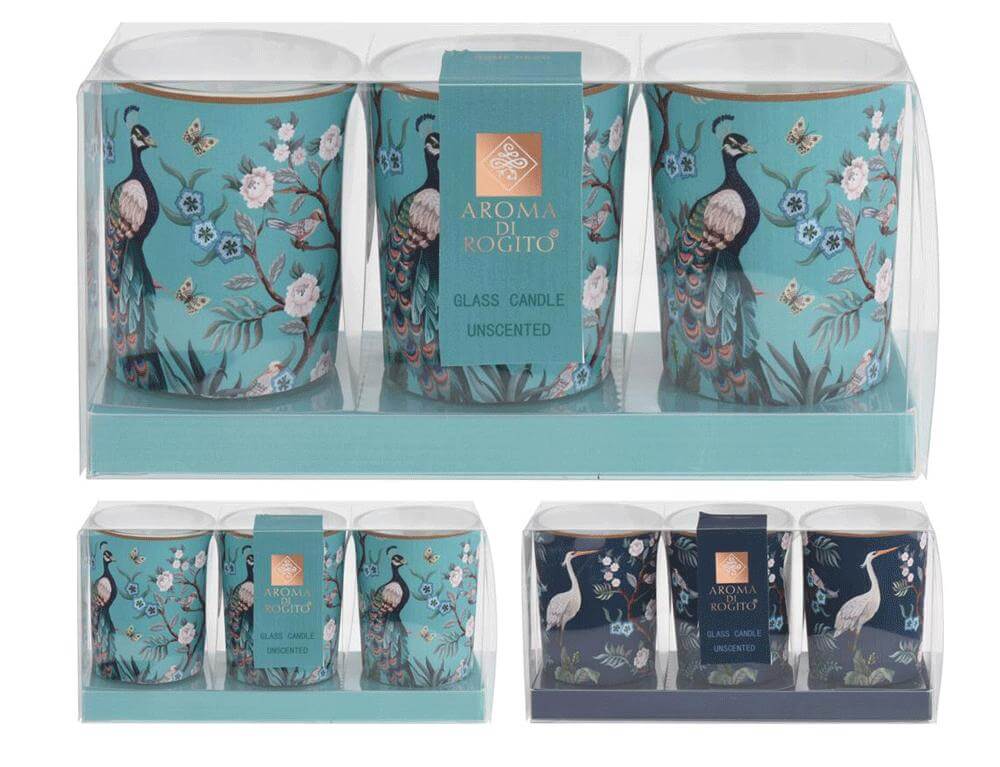 Σετ 3 τεμάχια Κεριά Residence CC5056330, σε γυάλινο δοχείο διακοσμημένο με χάρτινο περιτύλιγμα, με σχέδιο πτηνών και διάσταση σετ 16 x 5 x 8 cm. Διατίθενται σε 2 επιλογές χρώματος, μπλέ και πράσινο(σετ).