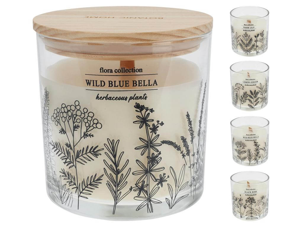Αρωματικό Κερί CC5072870 Σε γυάλινο δοχείο με ξύλινο καπάκι 10 x 10 cm, σε 4 επιλογές σχεδίου και αρώματος, lemon ginger, pomegramate noir, wild blue bella, lilac blossom.