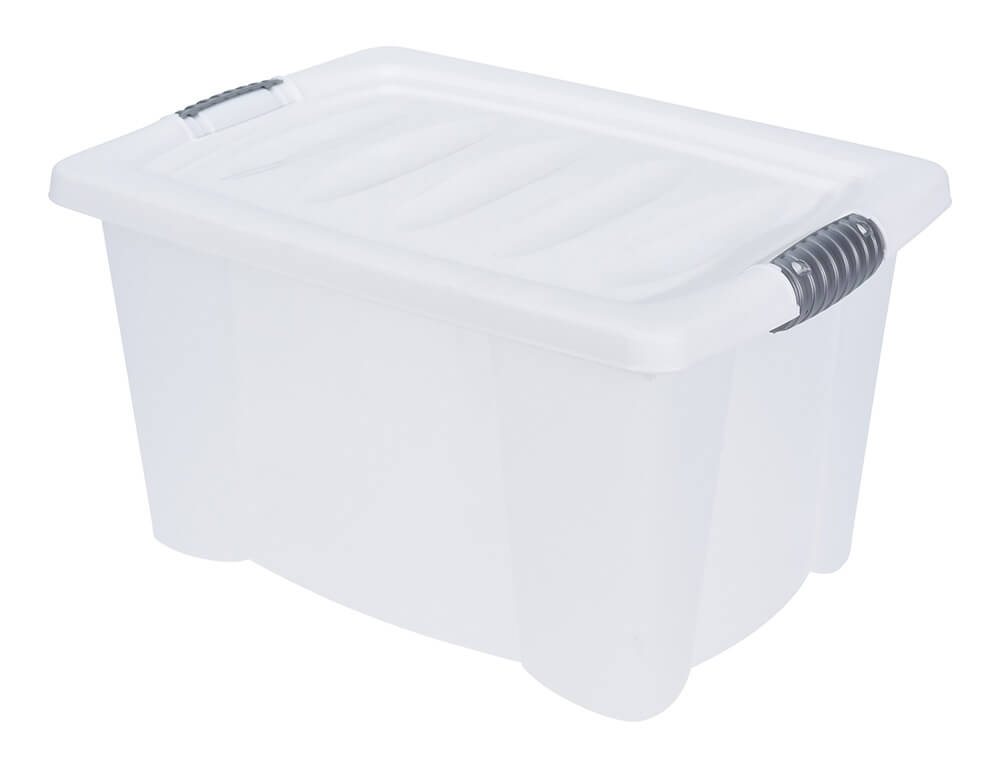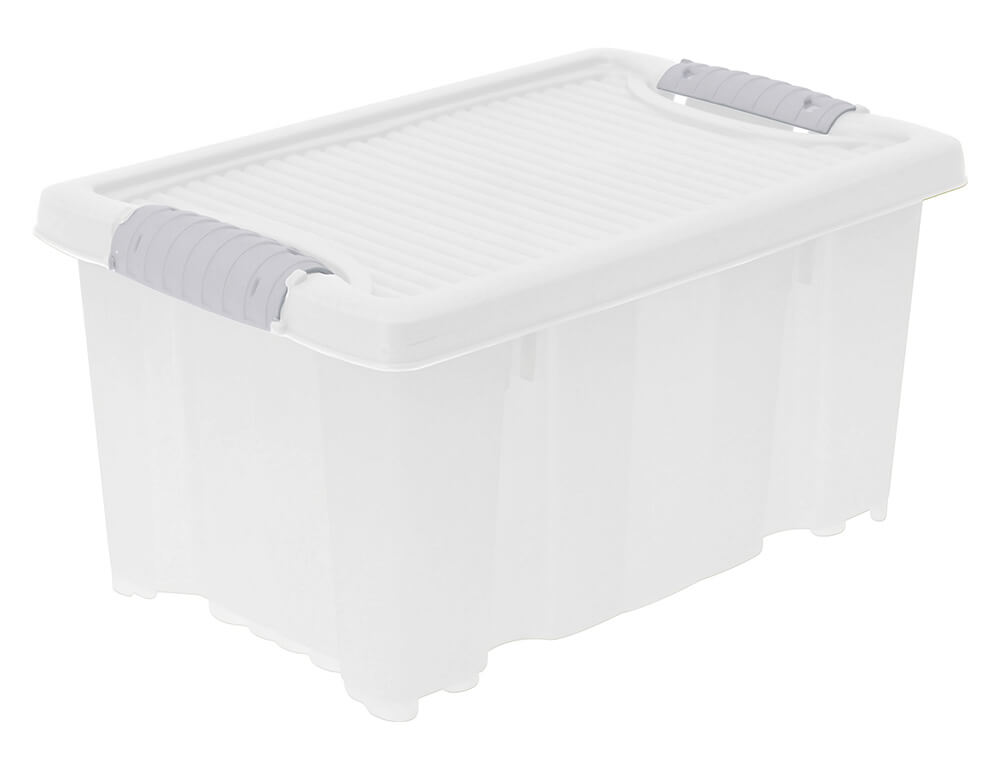 Κουτί αποθήκευσης πλαστικό διάφανο με άσπρο καπάκι και γκρι χερούλια. Είναι πολύ πρακτικό για την αποθήκευση διάφορων αντικειμένων και την τακτοποίηση του χώρου σας. Μπορείτε να δείτε εύκολα το περιεχόμενό του.