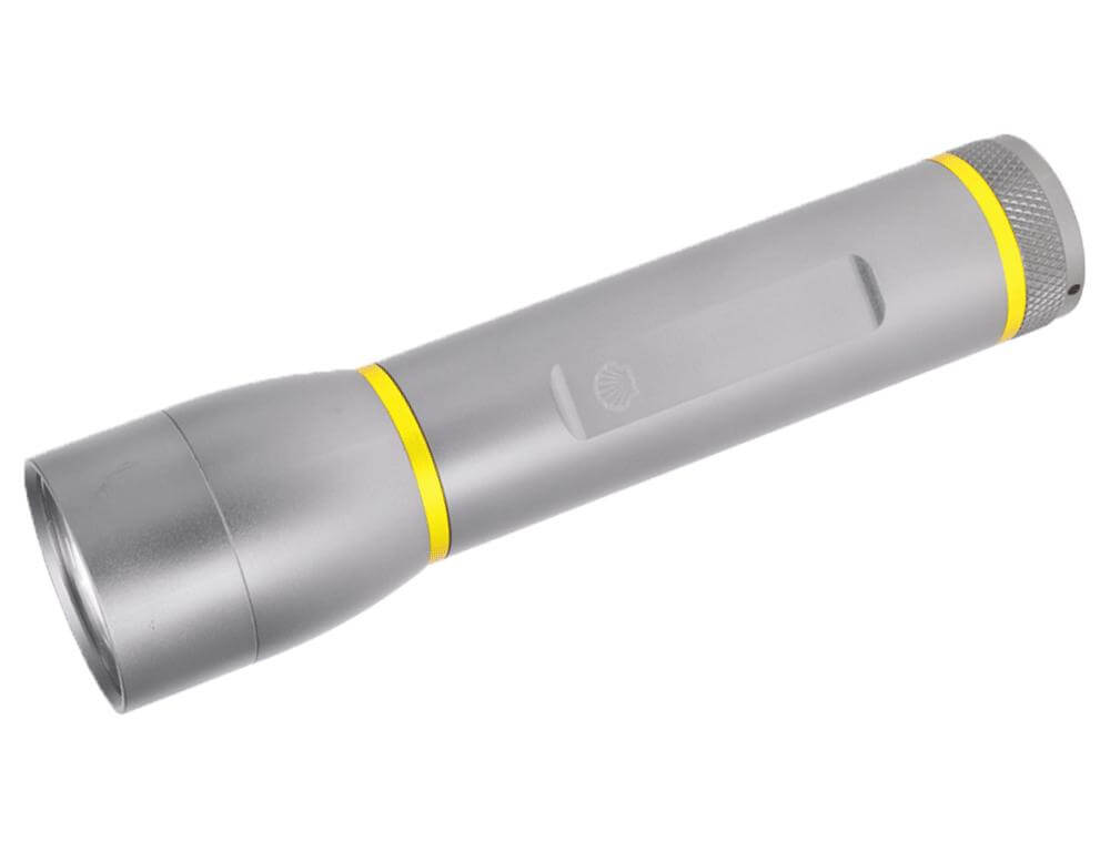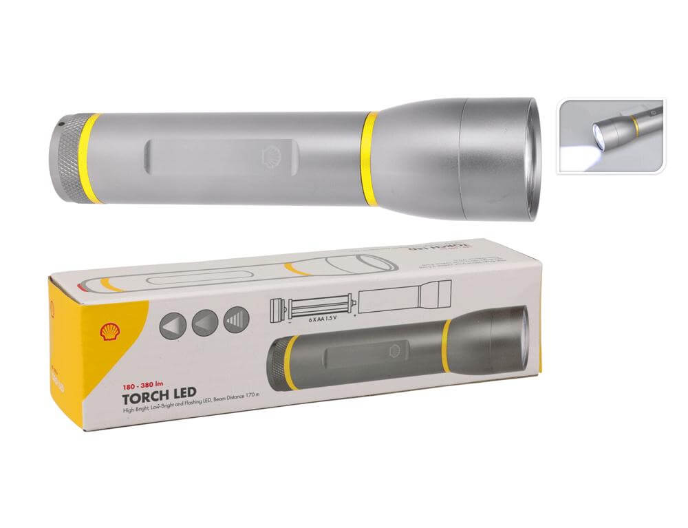Φακός LED Shell C22300330 380 lumen, aluminium alloy, σε ψυχρό γκρι χρώμα pantone 10c με κόκκινο κουμπί pantone 485c και κίτρινα δαχτυλίδια pantone 116c. Έχει αυτονομία έως και 6 ώρες (χαμηλή φωτεινότητα). Λειτουργεί με μπαταρίες 6X AA (δεν περιλαμβάνονται)