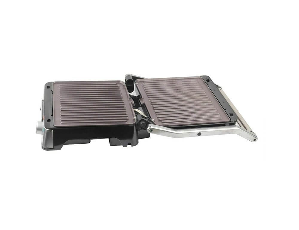 Λειτουργία ψηστιέρας με πλήρες άνοιγμα 180˚ σε ενιαία επιφάνεια: κατάλληλη για μεγάλες ποσότητες κρεατικών, ψαριών, λαχανικών κ.α.