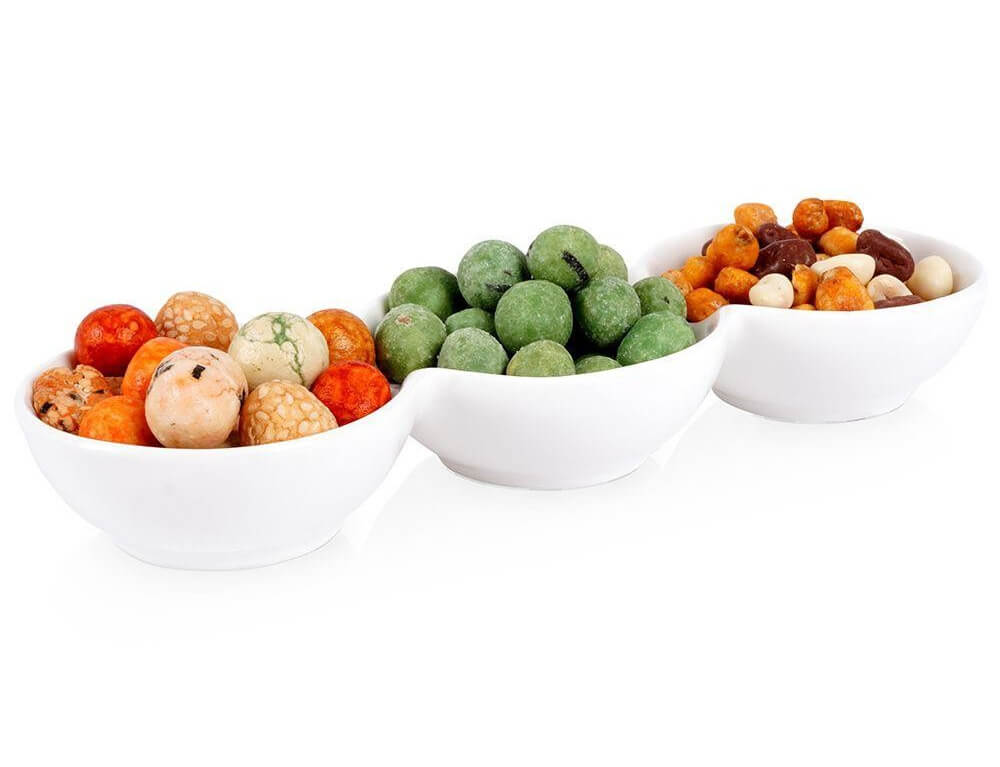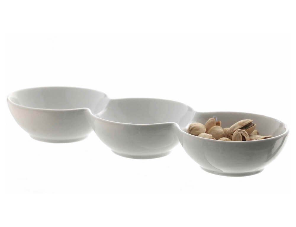 Μπολ για σνακ χωρισμένο σε τρεις θέσεις σερβιρίσματος. Το συνολικό μήκος του μπολ είναι 23,5 cm. Κάθε θέση έχει διαστάσεις 8 x 7,5 x 3 cm. Η χωρητικότητα καθενός από τα τρία μέρη είναι 40 ml. Το μπολ είναι κατασκευασμένο από λευκή πορσελάνη υψηλής ποιότητας. Mπορεί να χρησιμοποιηθεί ως μπολ για μικρά σνακ, π.χ. ξηρούς καρπούς, αποξηραμένα φρούτα. Ιδανικό για πάρτι, γιατί τα σνακ δεν αναμειγνύονται στο πιάτο, αλλά χωρίζονται σωστά. Μπορούμε επίσης να το χρησιμοποιήσουμε για να σερβίρουμε ντιπ χωρίς να ανησυχούμε για την ανάμειξή τους. Το μπολ πλένεται στο πλυντήριο πιάτων.