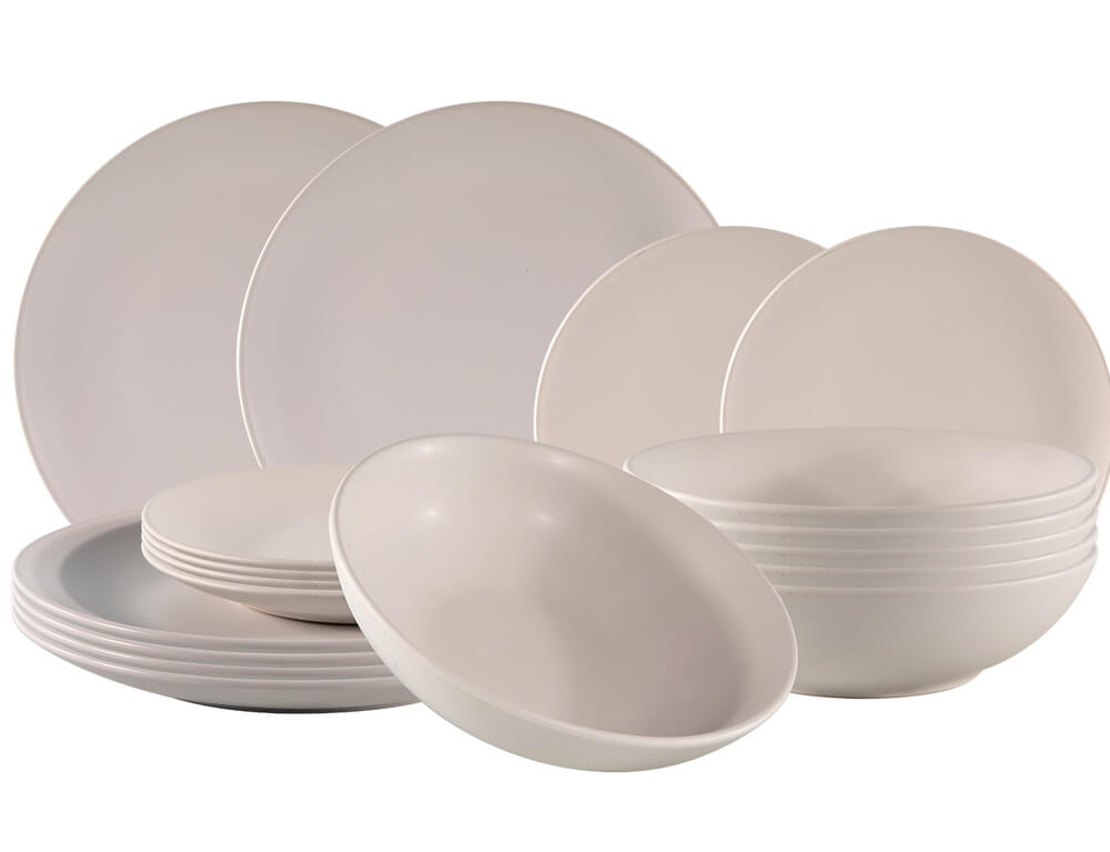 Αυτό το σετ κεραμικών πιάτων είναι διαχρονικό και έχει λευκό ματ χρώμα. Αυτό το σετ αποτελείται από 6x πιάτα δείπνου, 6x πιάτα πρωινού και 6x πιάτα σούπας. Μετά τη χρήση του σετ μπορετε εύκολα να το καθαριστετε στο πλυντήριο πιάτων.