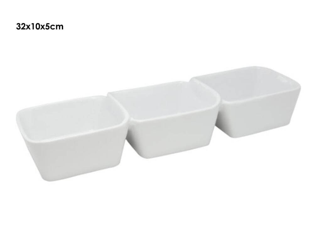 Τριπλό μπολ για σνακ χωρισμένο σε τρεις θέσεις σερβιρίσματος. Έχει εξωτερικές διαστάσεις 32x10x5cm. Είναι κατασκευασμένο από λευκή πορσελάνη υψηλής ποιότητας. Μπορεί να χρησιμοποιηθεί ως μπολ για μικρά σνακ, π.χ. ξηρούς καρπούς, αποξηραμένα φρούτα.