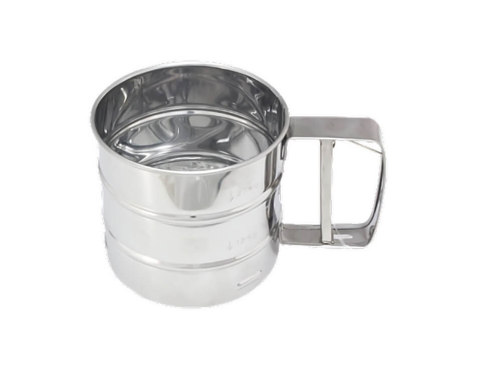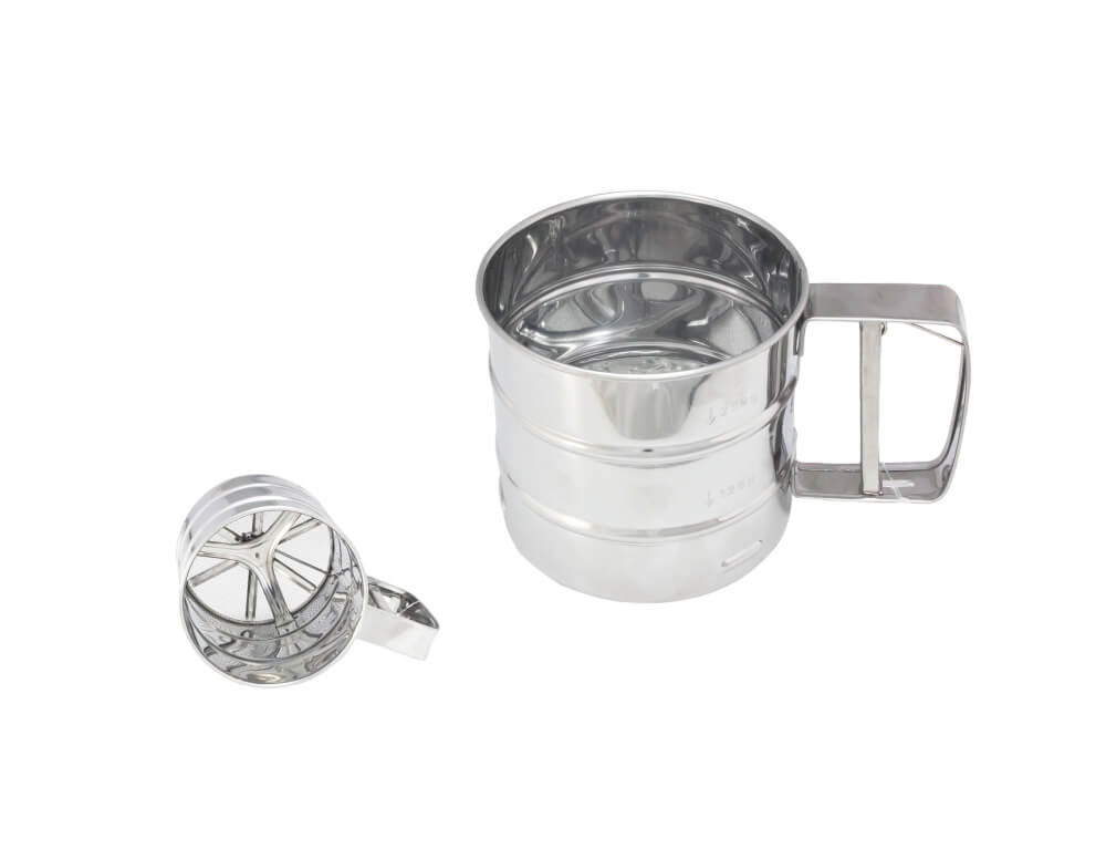Κόσκινο για αλεύρι ή ζάχαρη άχνη της εταιρείας HIT. Είναι κατασκευασμένο από ανοξείδωτο ατσάλι. Έχει μοχλό για να κάνει το κοσκίνισμα πιο εύκολο.