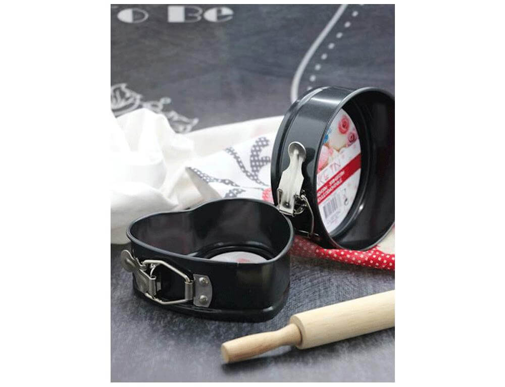 Αντικολλητικά φορμάκια κέικ Kitchen Tools, στρογγυλό και σε σχήμα καρδιάς. Μια ενδιαφέρουσα λύση, ιδανική για να ετοιμάσετε μίνι κέικ. Μαύρο χρώμα. Λαδώστε ελαφρά πριν τη χρήση. Μην χρησιμοποιείτε αιχμηρά αντικείμενα για να αφαιρέσετε την έτοιμη ζύμη. Η θερμοκρασία δεν πρέπει να υπερβαίνει τους 210 C. Μετά από κάθε χρήση, το καλούπι πρέπει να πλένεται και να στεγνώνει καλά. Μην χρησιμοποιείτε τραχιά σφουγγάρια ή αιχμηρές σκόνες καθαρισμού για τον καθαρισμό. Μπορείτε να διαχωρίζετε εύκολα τις πλευρές από το κάτω μέρος του ταψιού, με ελατήριο.