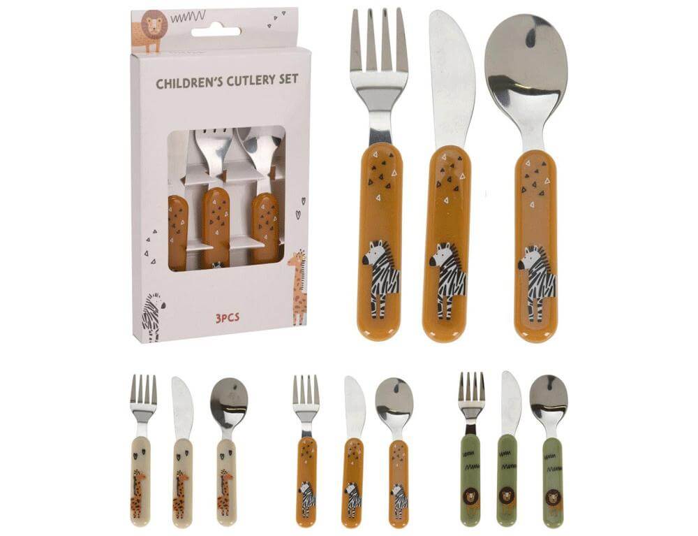 Μαχαιροπίρουνα από ανοξείδωτο ατσάλι με πλαστική λαβή και σχέδιο ζωάκι. Περιλαμβάνει 1τμχ κουτάλι, 1τμχ πιρούνι και 1τμχ μαχαίρι. Κατάλληλο για πλυντήριο πιάτων. Ασφαλές για τρόφιμα. Διατίθεται σε διάφορα σχέδια.