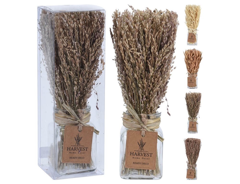 Tα διακοσμητικά χόρτα, που θυμίζουν στάχυα, σε ένα γυάλινο τετράγωνο βάζο, αποτελούν μια φυσική διακόσμηση για το χώρο σας. Οι χρωματικοί τόνοι του φυτού ταιριάζουν σε κάθε είδος διακόσμησης σπιτιού και μπορεί να τοποθετηθεί σε εσωτερικούς και σε εξωτερικούς χώρους. Έχει ύψος 22 cm και μπορείτε να το βάλετε είτε σε κάποιο τραπέζι είτε σε κάποιο ράφι.
