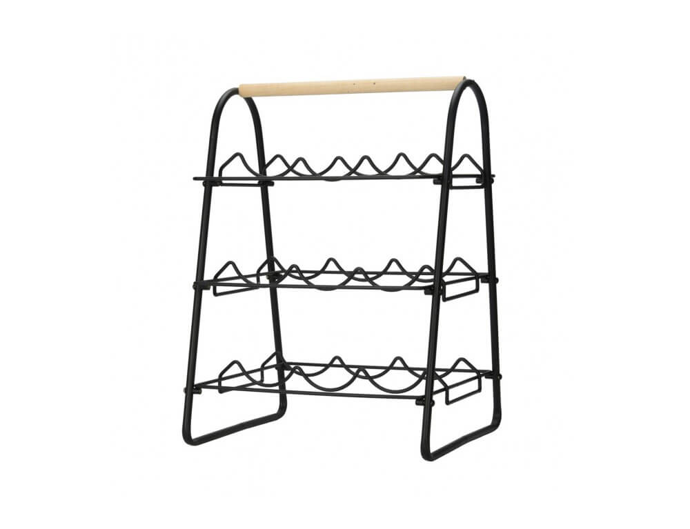 Μια πρακτική θήκη για μπουκάλια από μέταλλο και ξύλο. Ιδανική για να κρατήσετε οργανωμένη την κάβα σας στο σαλόνι, την τραπεζαρία ή την κουζίνα. Η μαύρη επίστρωση πούδρας του εξασφαλίζει μεγάλη διάρκεια ζωής. Η σχάρα κρασιού είναι κατάλληλη για αποθήκευση έως και 9 φιαλών. Είναι κατασκευασμένη από μέταλλο υψηλής ποιότητας, γεγονός που την καθιστά ανθεκτική στο χρόνο και δεν σκουριάζει. Διαθέτει ξύλινη λαβή για πιο εύκολη μεταφορά.