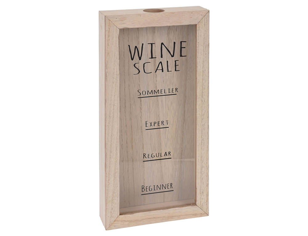 Το δοχείο είναι κατασκευασμένο από ξύλο και το μπροστινό το μέρος είναι γυάλινο για να βλέπετε τι υπάρχει μέσα χωρίς να χρειαστεί να το ανοίξετε. Επίσης, στο γυαλί υπάρχει σχεδιασμένο το επίπεδο της «ανόδου» σας ανάλογα με το πόσα μπουκάλια κρασιού έχετε ανοίξει - αρχάριος, κανονικός, ειδικός, σομελιέ. Διαθέτει 2 γάντζους στο πίσω μέρος για να το κρεμάσετε στον τοίχο αν θέλετε.