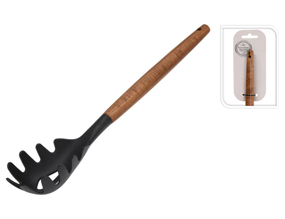 Η κουτάλα ζυμαρικών σας επιτρέπει να βάλετε τα ζυμαρικά γρήγορα και εύκολα στο πιάτο. Διαθέτει ξύλινη λαβή, η οποία δεν ζεσταίνεται και μπορείτε να την κρεμάσετε όπου θέλετε χάρη στην τρύπα που έχει στην άκρη. Είναι κατασκευασμένη από υλικά υψηλής ποιότητας που είναι ανθεκτικά σε υψηλές θερμοκρασίες. Δεν γρατσουνίζει τα πιάτα και τις κατσαρόλες και μπορεί να χρησιμοποιηθεί για όλους τους τύπους μαγειρικών σκευών.