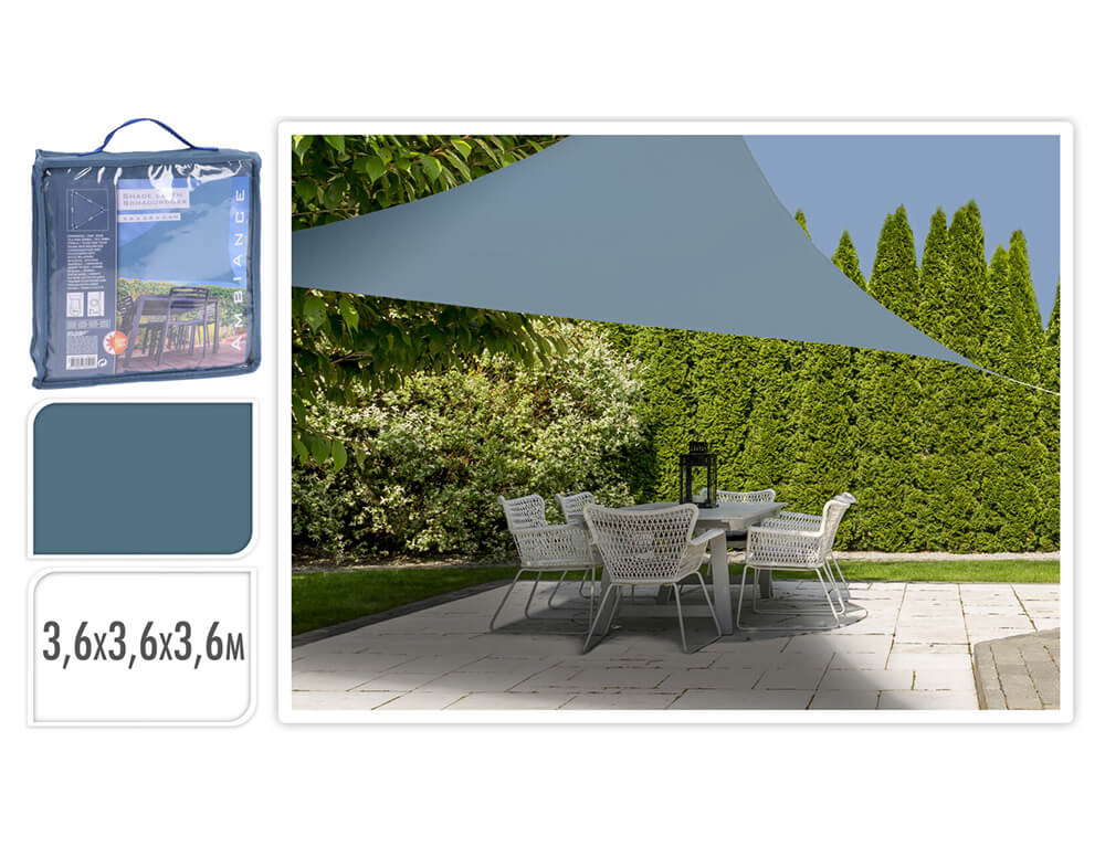 Πανί σκίασης σε τριγωνικό σχήμα και με διαστάσεις 3.6x3.6x3.6m για να απολαμβάνετε τον κήπο ή την βεράντα σας όλες τις ώρες της ημέρας. Το ύφασμα είναι ανθεκτικό στον ήλιο και μπλοκάρει έως και 90% τις ακτίνες UV και την ηλιακή θερμότητα. Στήνεται εύκολα στον κήπο, στη βεράντα ή στο μπαλκόνι χάρη στα 3 σκοινιά (2,3m) και τα μεταλλικά άγκιστρα που περιλαμβάνονται.