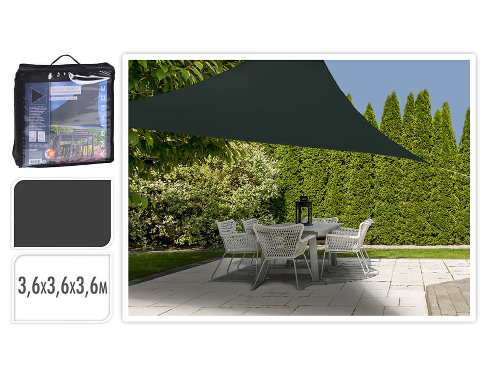 Πανί σκίασης σε τριγωνικό σχήμα και με διαστάσεις 3.6x3.6x3.6m για να απολαμβάνετε τον κήπο ή την βεράντα σας όλες τις ώρες της ημέρας. Το ύφασμα είναι ανθεκτικό στον ήλιο και μπλοκάρει έως και 90% τις ακτίνες UV και την ηλιακή θερμότητα. Στήνεται εύκολα στον κήπο, στη βεράντα ή στο μπαλκόνι χάρη στα 3 σκοινιά (2,3m) και τα μεταλλικά άγκιστρα που περιλαμβάνονται.
