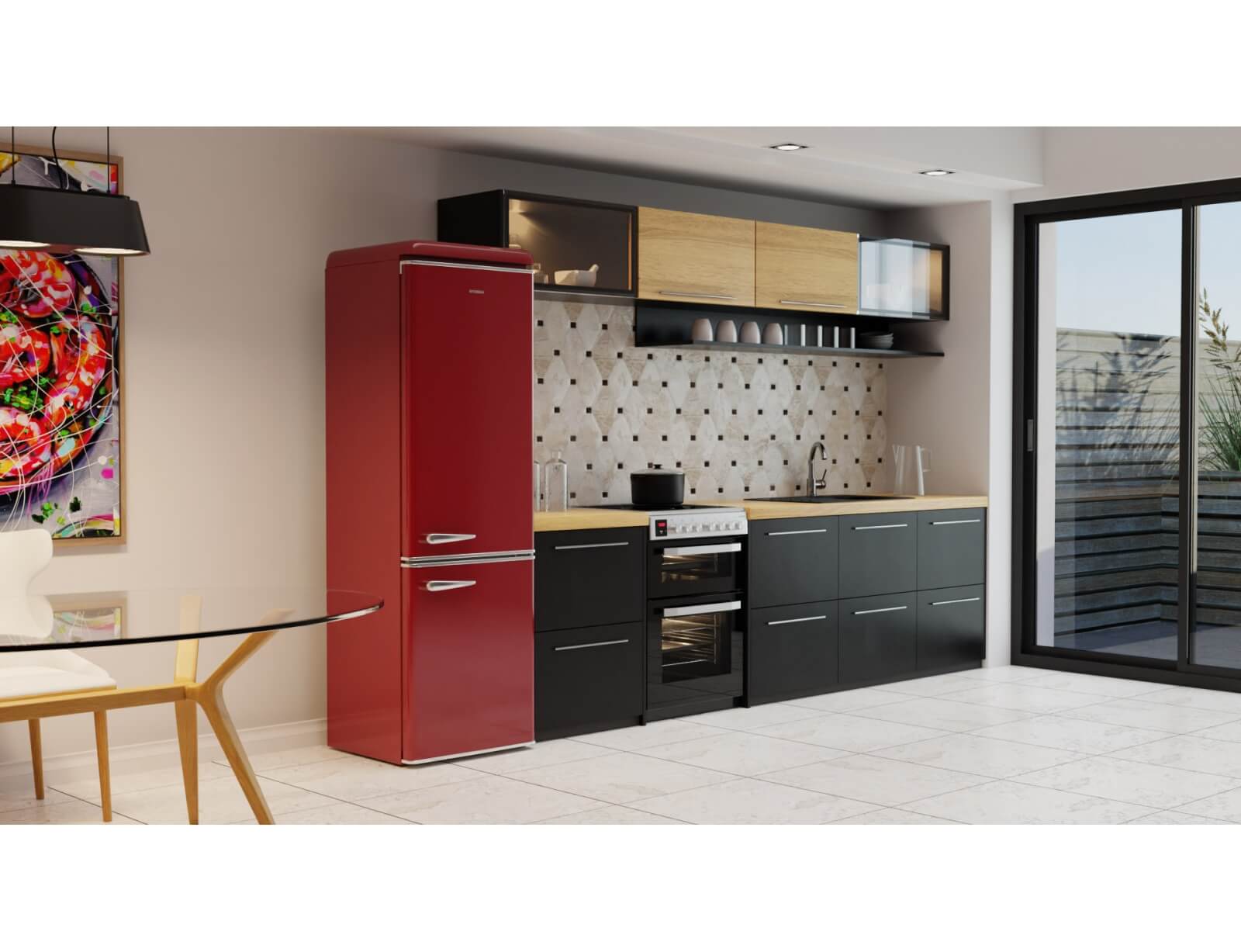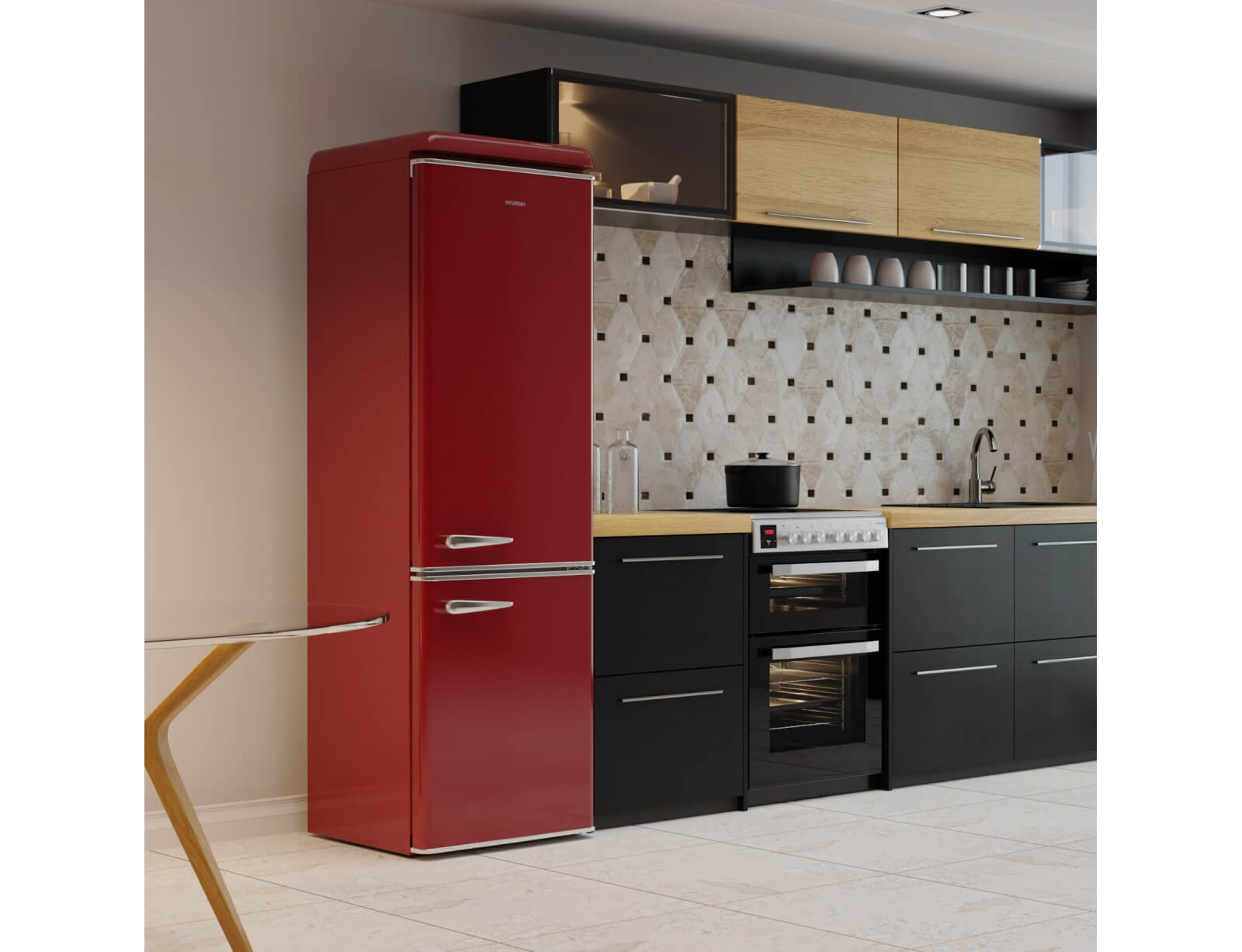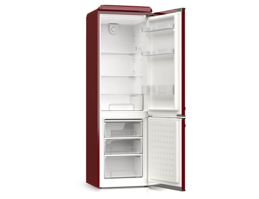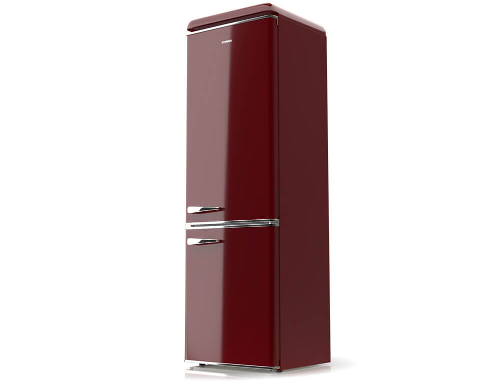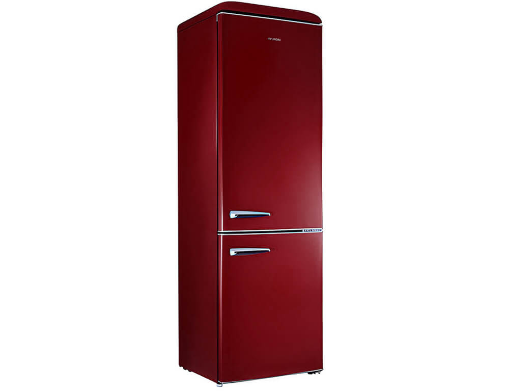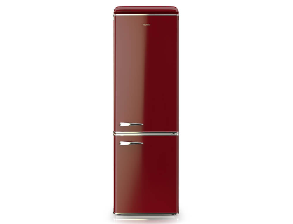 Ψυγειοκαταψύκτης Hyundai HCVG23-310R με ρετρό σχεδιασμό σε κόκκινο χρώμα, χωρητικότητα τροφίμων που φθάνει τα 300 λίτρα και υψηλή απόδοση E για εξοικονόμηση ενέργειας.