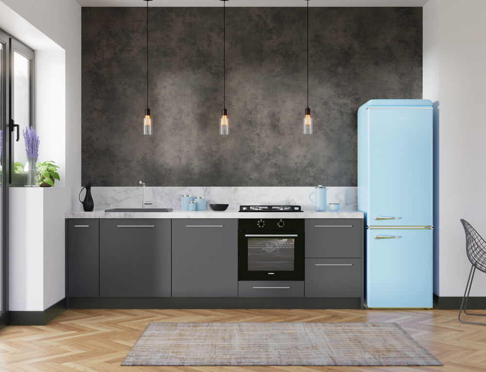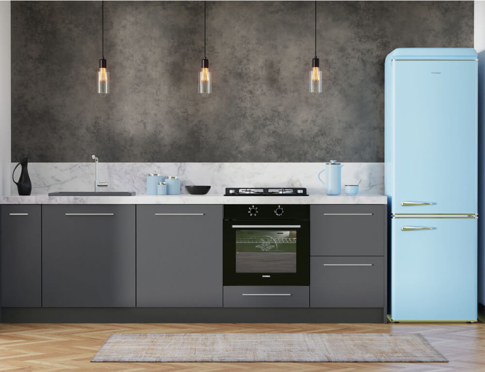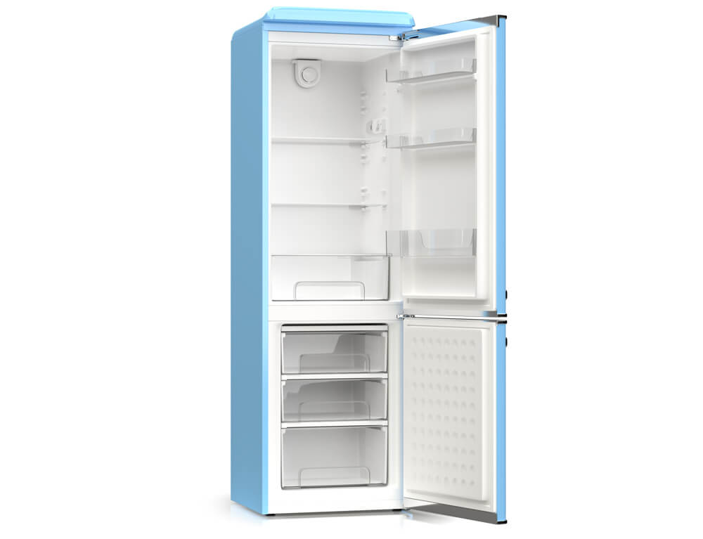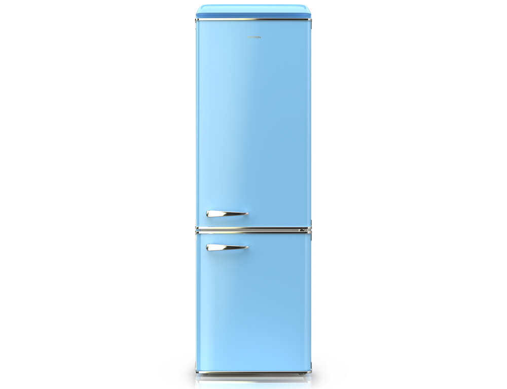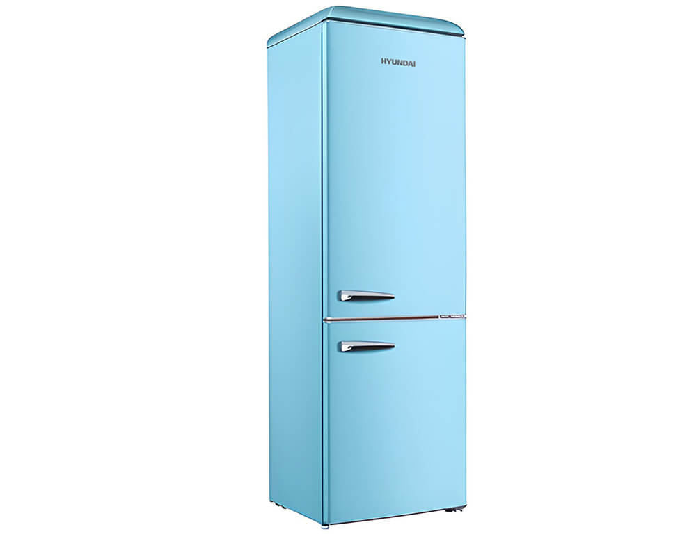Ψυγειοκαταψύκτης Hyundai HCVG23-310BL με ρετρό σχεδιασμό σε γαλάζιο χρώμα, χωρητικότητα τροφίμων που φθάνει τα 300 λίτρα και υψηλή απόδοση E για εξοικονόμηση ενέργειας.