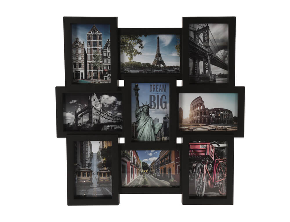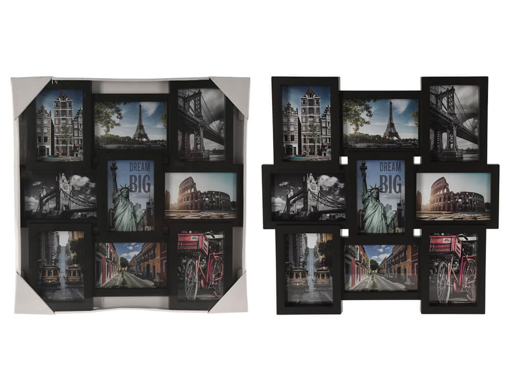 Κορνίζα τοίχου με θέσεις για 9 φωτογραφίες διάστασης 10x15cm σε διάφορα επίπεδα. Είναι κατασκευασμένη από πλαστικό σε μαύρη απόχρωση. Είναι ιδανική για να διακοσμήσετε οποιοδήποτε χώρο του σπιτιού ή του γραφείου σας με τις πιο όμορφες αναμνήσεις σας!