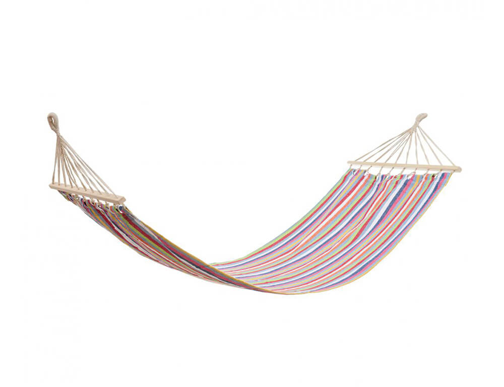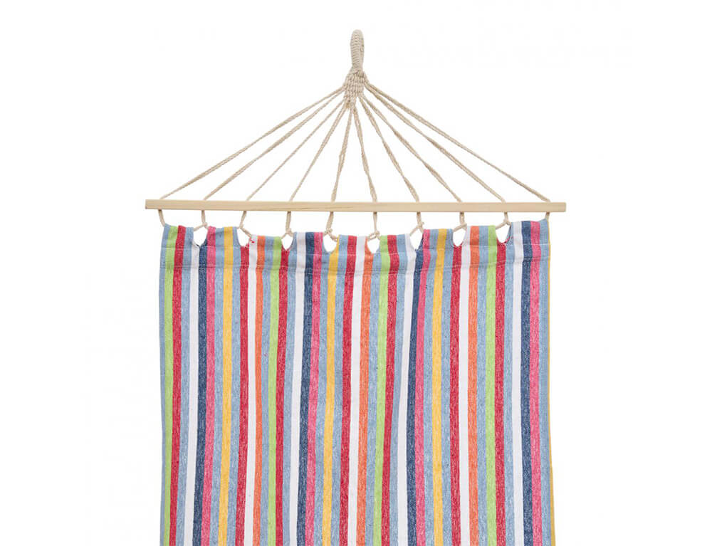 Απολαύστε ένα απόγευμα στον ήλιο ή χαλαρώστε με ένα καλό βιβλίο στη σκιά με αυτήν την αιώρα. Είναι κατασκευασμένη από πολυεστέρα και βαμβάκι, ενώ διαθέτει σχοινιά και στις δύο πλευρές για να την κρεμάσετε. Παράλληλα υπάρχει για καλύτερη στήριξη ξύλινο πλαίσιο στις άκρες της αιώρας.