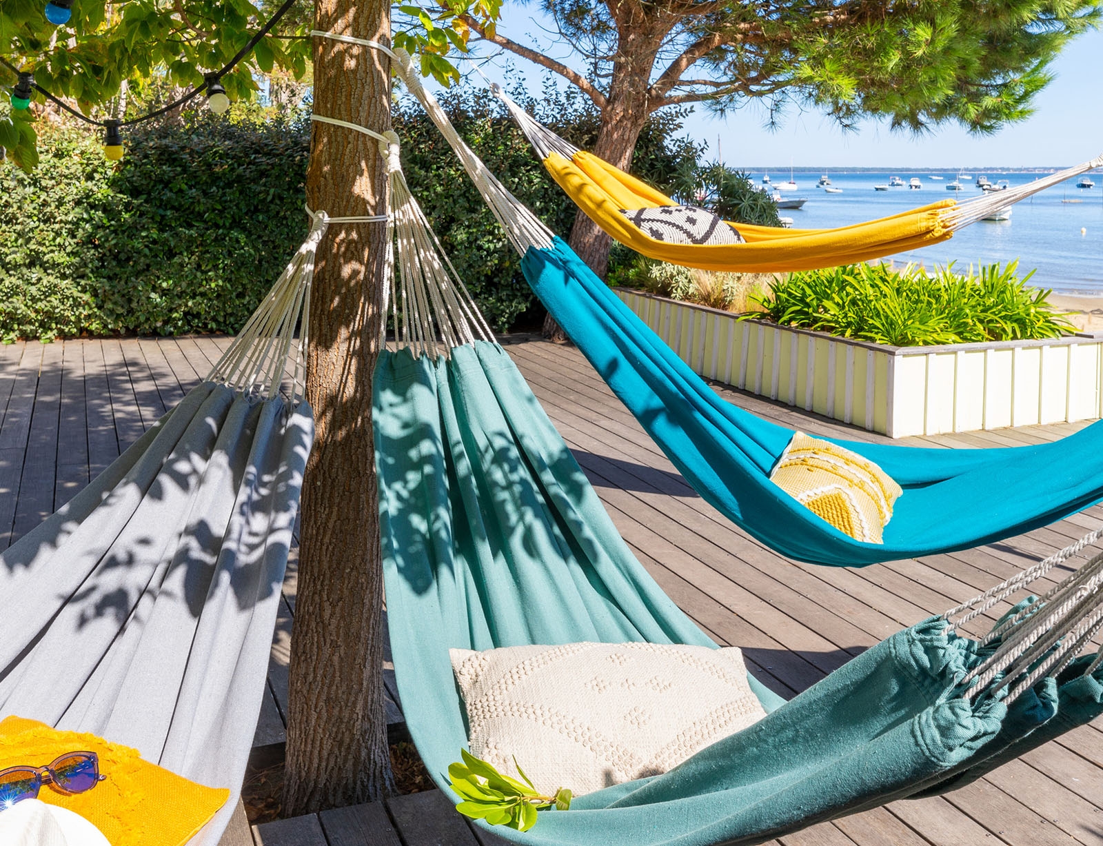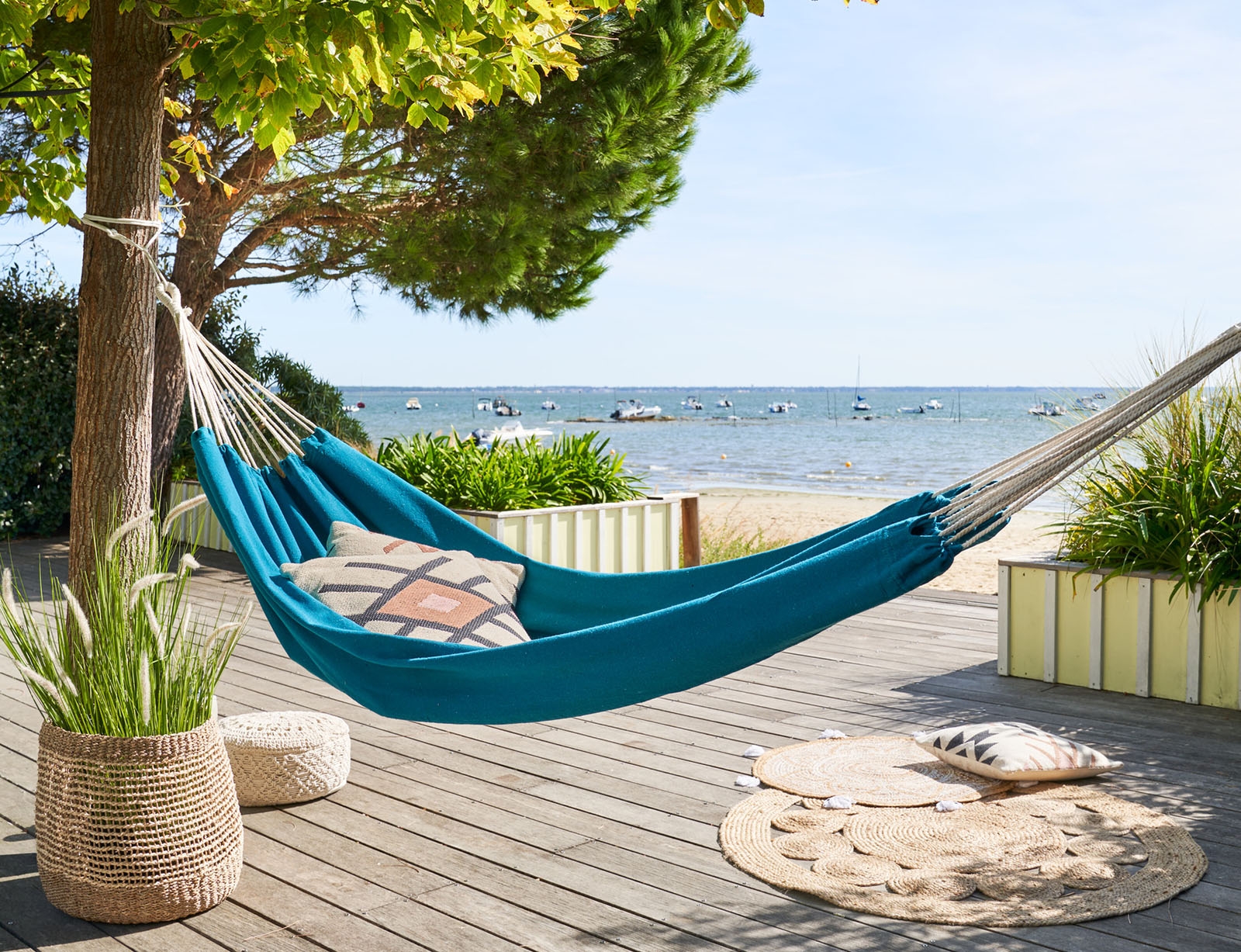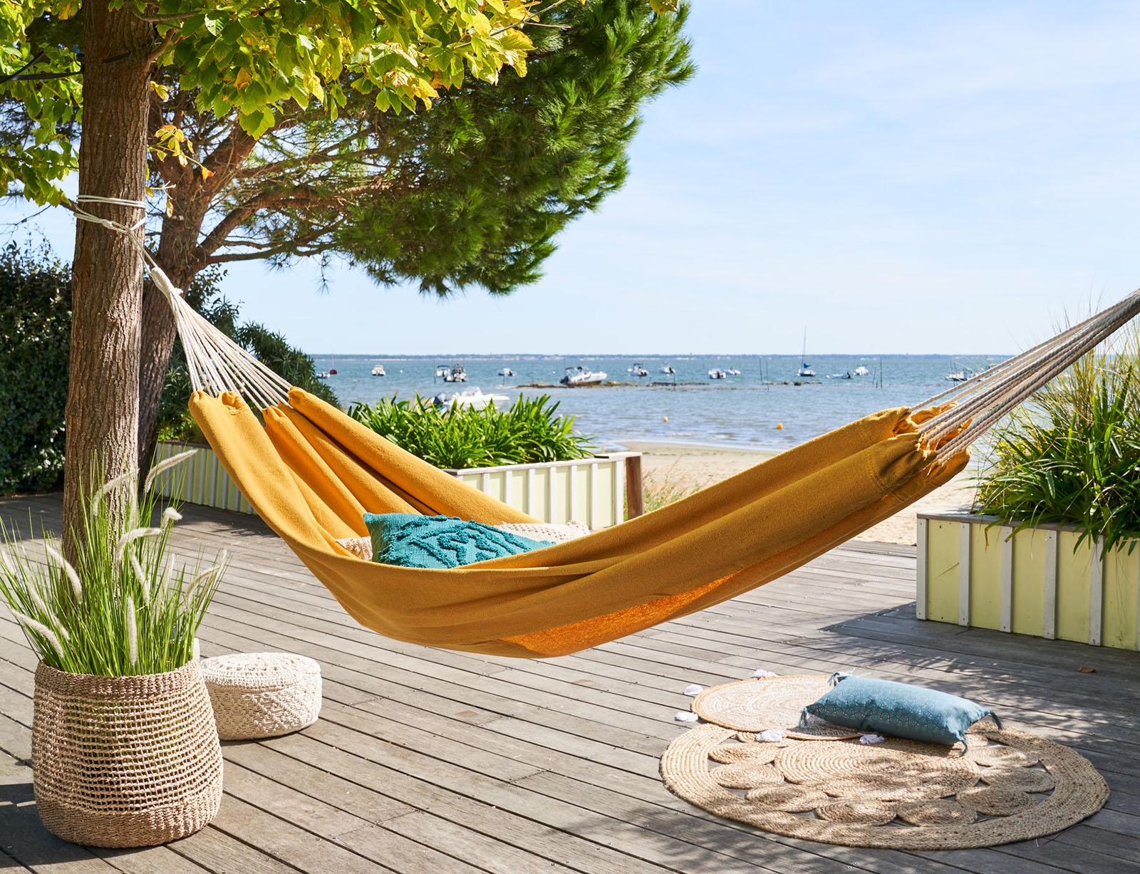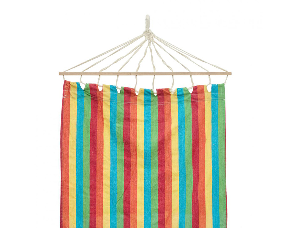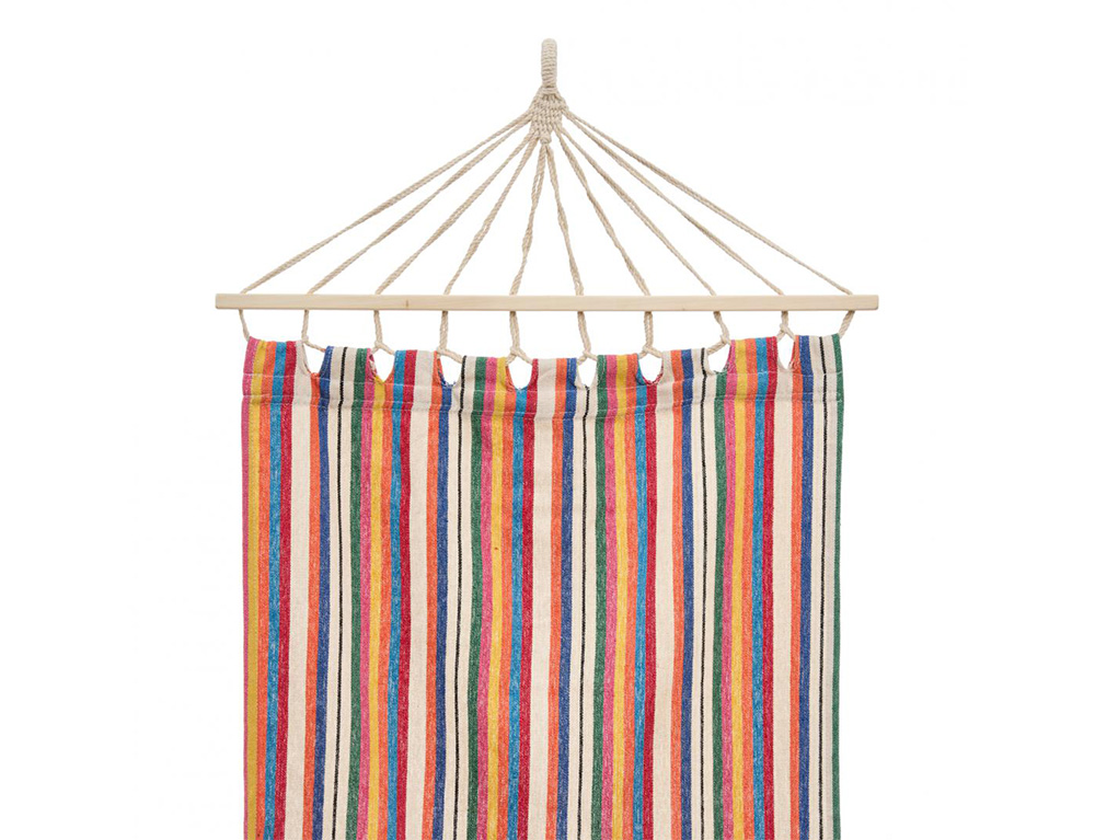 Απολαύστε ένα απόγευμα στον ήλιο ή χαλαρώστε με ένα καλό βιβλίο στη σκιά με αυτήν την αιώρα. Είναι κατασκευασμένη από πολυεστέρα και βαμβάκι, ενώ διαθέτει σχοινιά και στις δύο πλευρές για να την κρεμάσετε. Παράλληλα υπάρχει για καλύτερη στήριξη ξύλινο πλαίσιο στην άκρη της αιώρας.