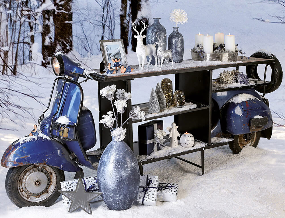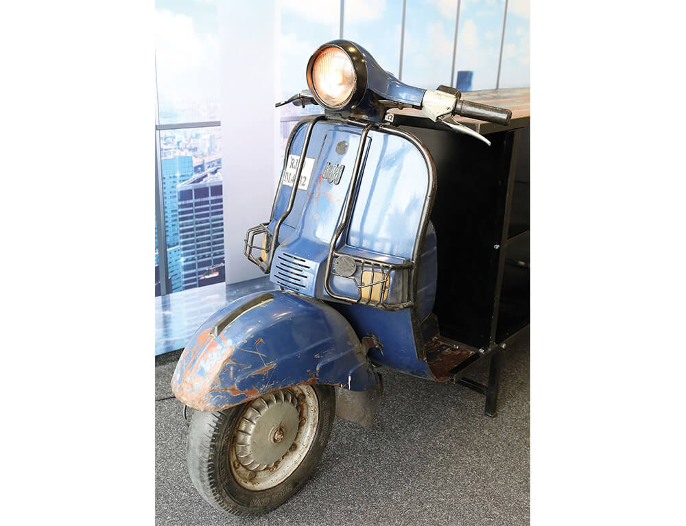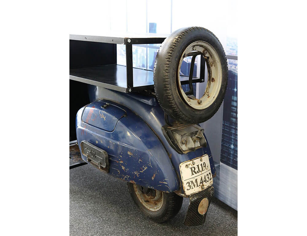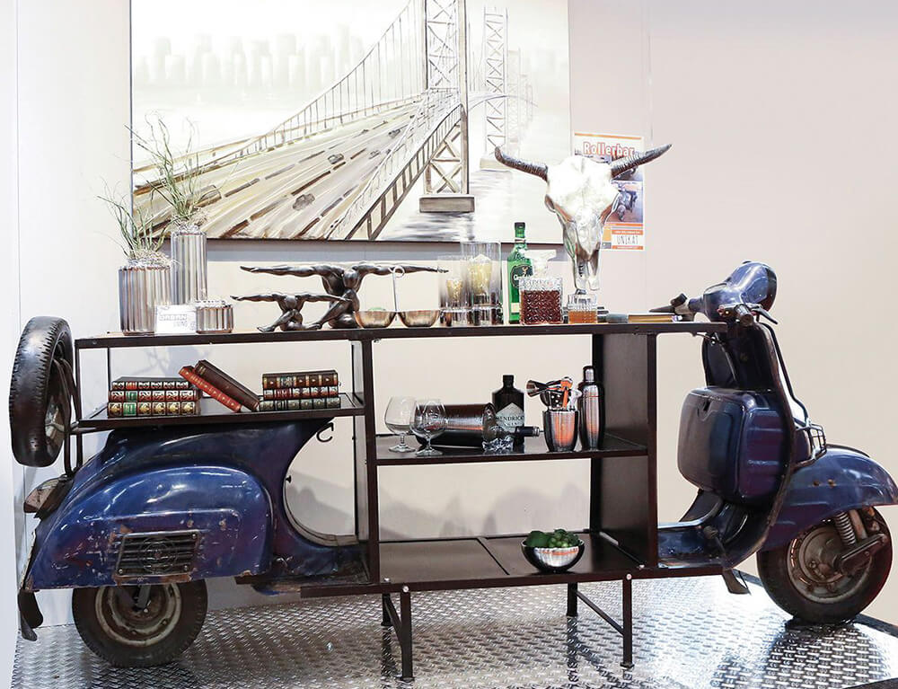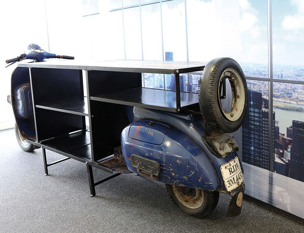 Μια vintage μοτοσυκλέτα βέσπα σε συνδυασμό με μία ραφιέρα από μασίφ ξύλο mango, μετατρέπεται σε ένα μοναδικό έπιπλο που θα αποτελέσει μια εκκεντρική προσθήκη στο εσωτερικό του σπιτιού ή του γραφείου σας. Αποτελείται από τρία ράφια, μια μεγάλη επιφάνεια και μια λάμπα στο τιμόνι της μοτοσυκλέτας. Η ραφιέρα είναι κατασκευασμένη από ξύλο mango, ένα ξύλο εξαιρετικά βιώσιμο και φιλικό προς το περιβάλλον με υψηλή αντοχή, ενώ η μοτοσυκλέτα αποτελεί προϊόν upcycling.
