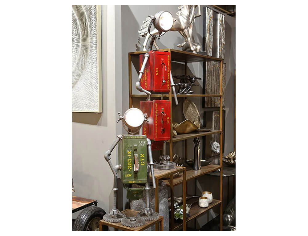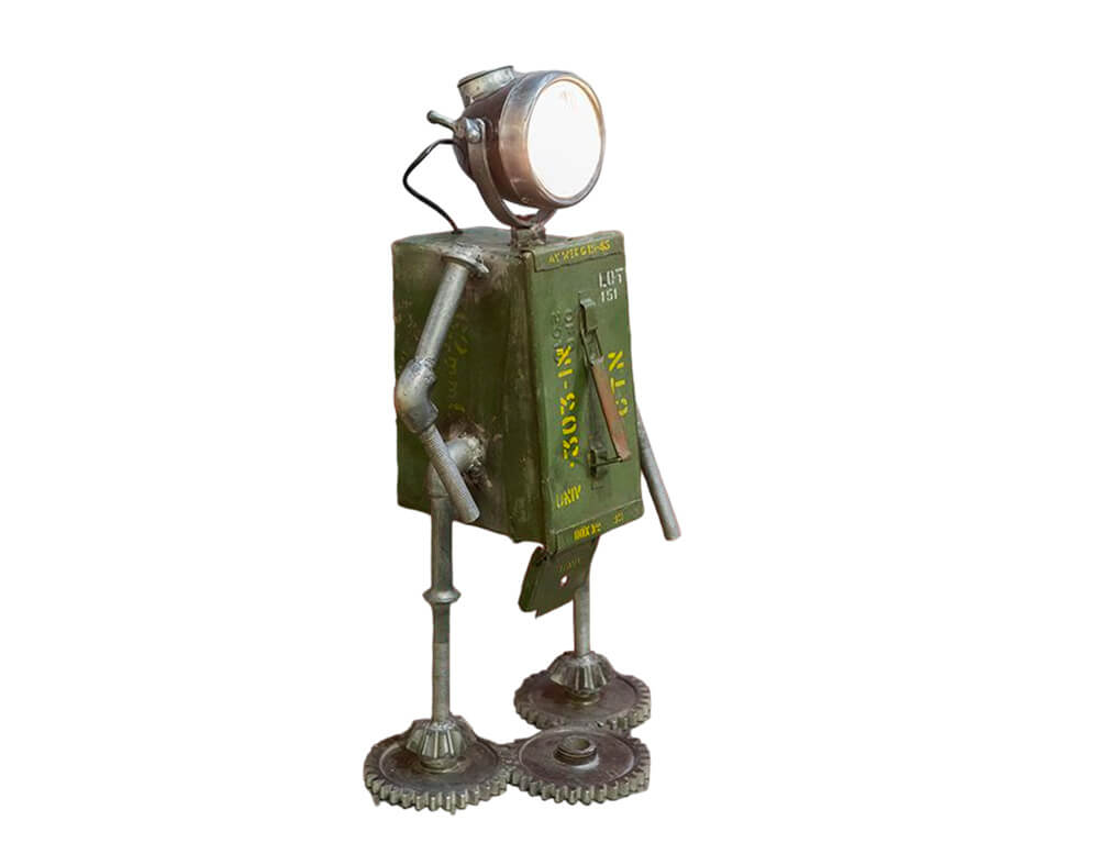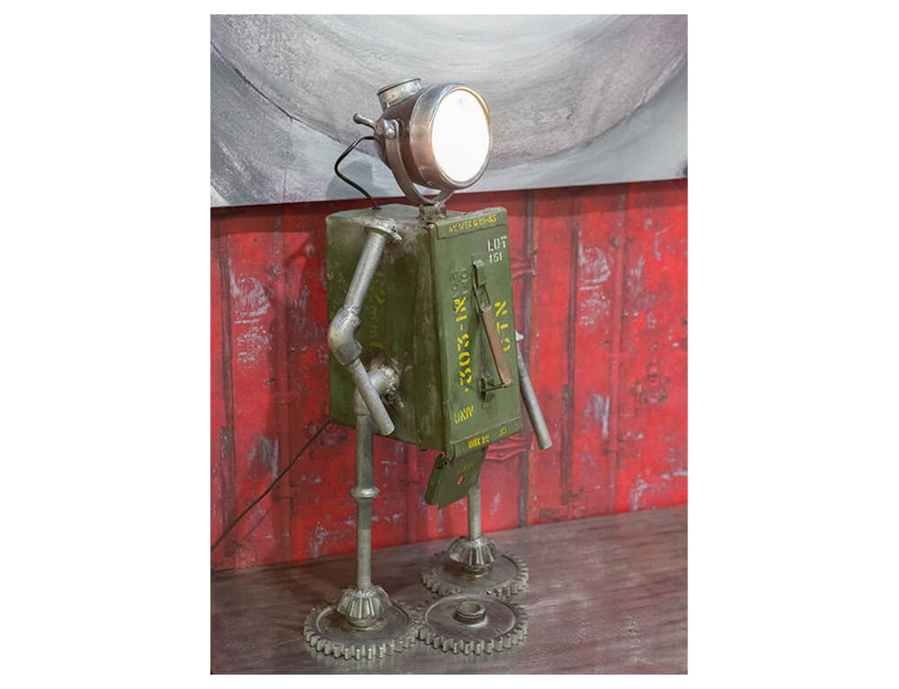 Το επιτραπέζιο φωτιστικό σε σχήμα ρομπότ είναι μια μοναδική επιλογή και θα δώσει μια πιο steampunk νότα στη διακόσμηση του σπιτιού σας. Ο σκελετός είναι κατασκευασμένος από μέταλλο και το κυρίως σώμα του αποτελείται από ένα κουτί πυρομαχικών, το οποίο λειτουργεί και ως αποθηκευτικός χώρος.