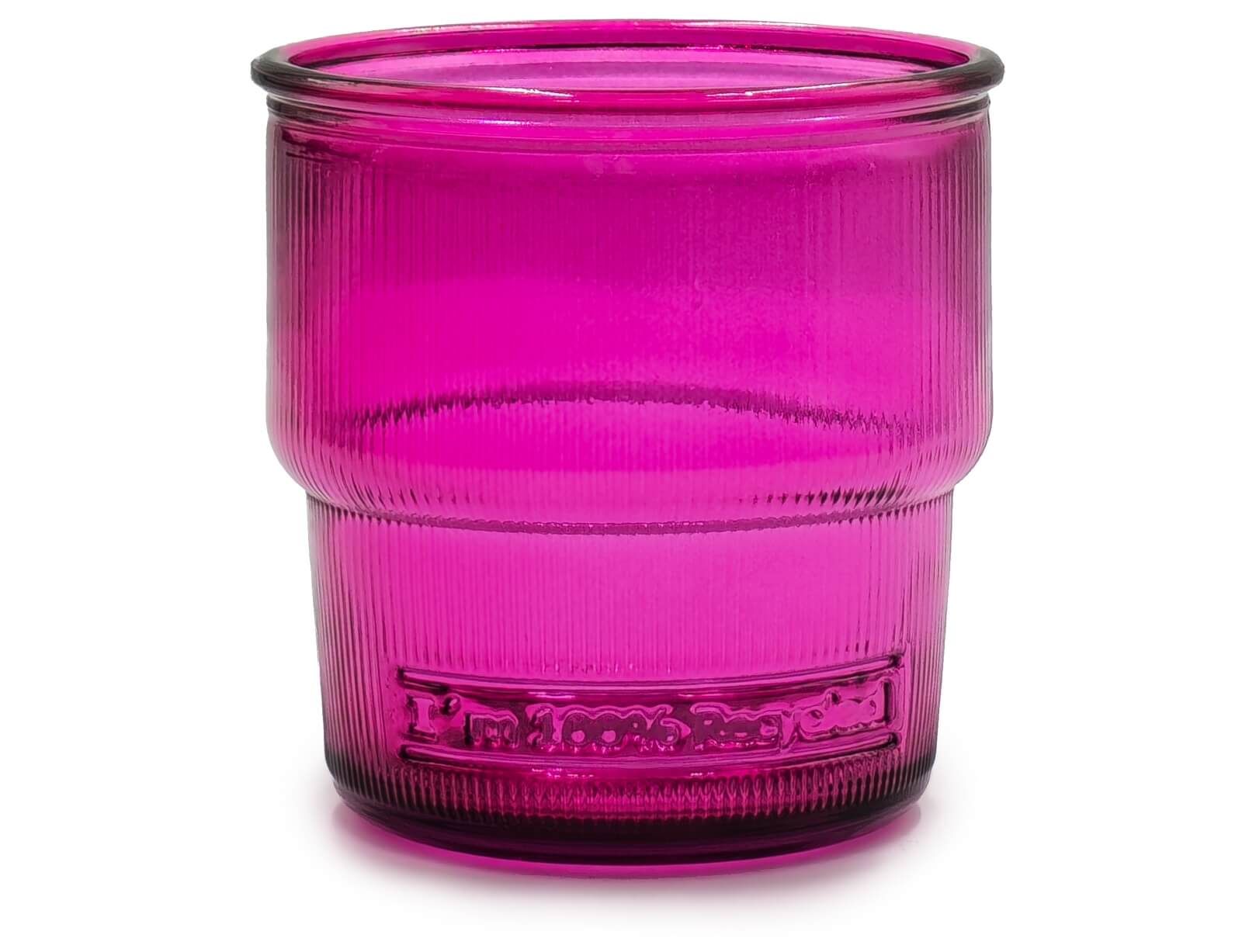 Ποτήρι με περίτεχνο και ανάγλυφο σχεδιασμό, ιδανικό για να σερβίρετε νερό, χυμό ή οποιοδήποτε ρόφημα επιθυμείτε! Κατασκευάζεται από 100% ανακυκλωμένο γυαλί και διαθέτει μια φούξια απόχρωση. Ένα εντυπωσιακό ποτήρι τόσο αισθητικά όσο και περιβαλλοντικά!
