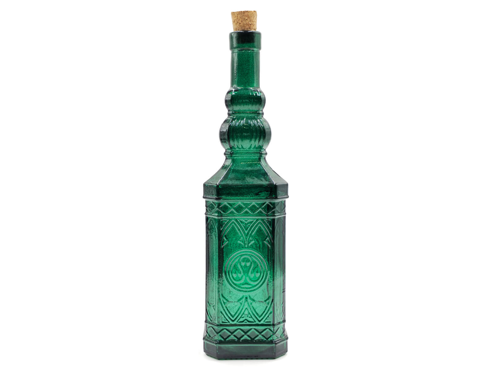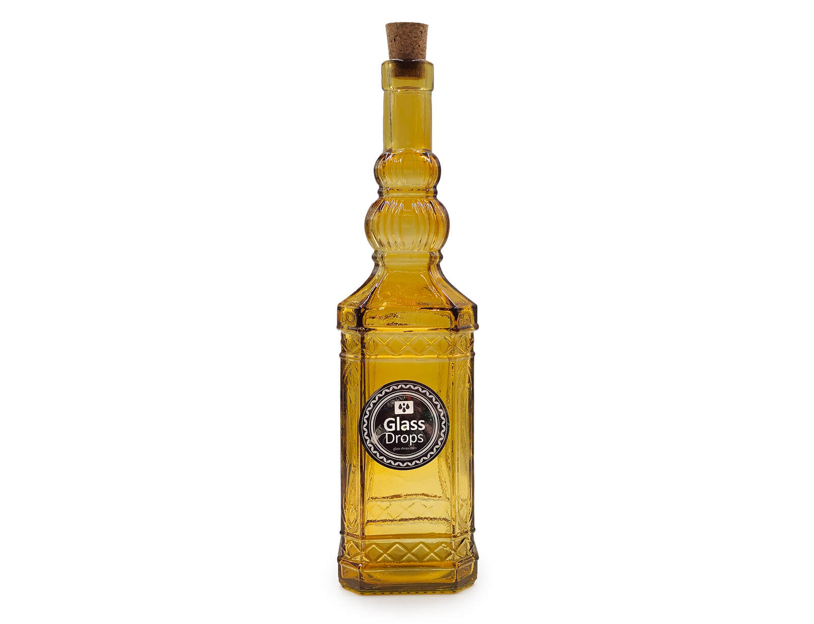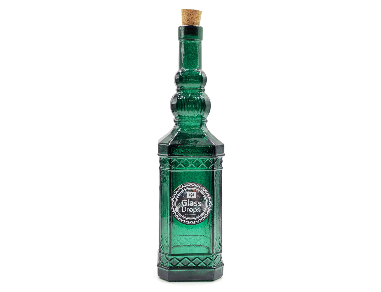 Μπουκάλι με περίτεχνο και ανάγλυφο σχεδιασμό από την εταιρεία Glass Drops. Eίναι ιδανικό για την αποθήκευση και σερβίρισμα λαδιού, νερού, χυμών, ποτών και ότι άλλο επιθυμείτε. Διαθέτει ένα πώμα από φελλό, το οποίο εξασφαλίζει ότι το περιεχόμενο του μπουκαλιού θα παραμείνει φρέσκο. Θα δώσει μια ξεχωριστή νότα στην κουζίνα και το τραπέζι σας. Μπορεί να χρησιμοποιηθεί και ως διακοσμητικό. Eίναι κατασκευασμένο από 100% ανακυκλωμένο γυαλί και διαθέτει μια πράσινη απόχρωση.