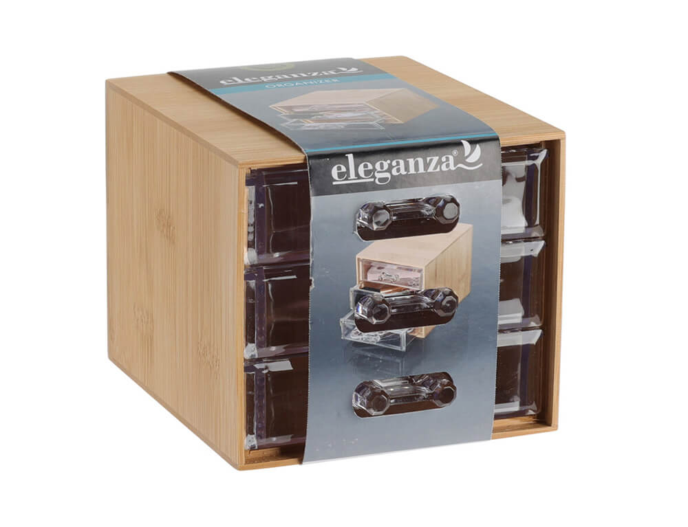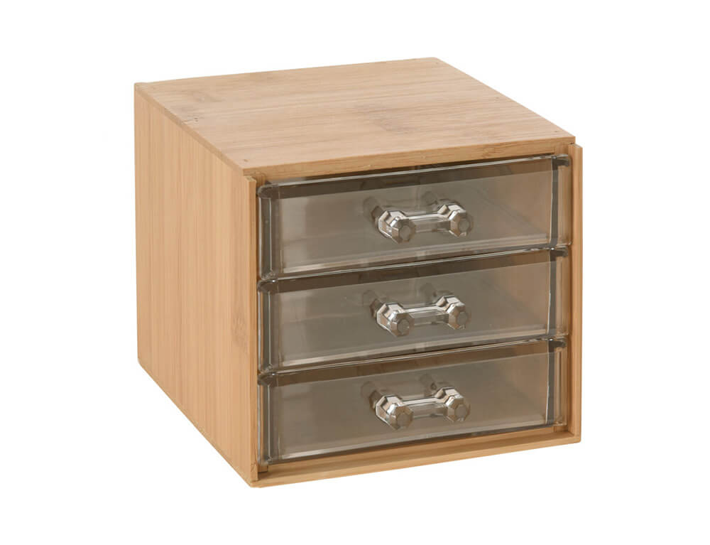 Οργανώστε το χώρο σας με τη συρταριέρα από την Eleganza. Είναι κατασκευασμένη από ξύλο μπαμπού, ένα ανθεκτικό υλικό και ταιριάζει σε κάθε είδος διακόσμησης. Διαθέτει 3 συρτάρια και είναι ιδανική για να οργανώσετε τα πινέλα, αξεσουάρ περιποίησης ή τα καλλυντικά που χρησιμοποιείτε περισσότερο. Τα συρτάρια είναι διάφανα για να βλέπετε εύκολα το περιεχόμενό τους.