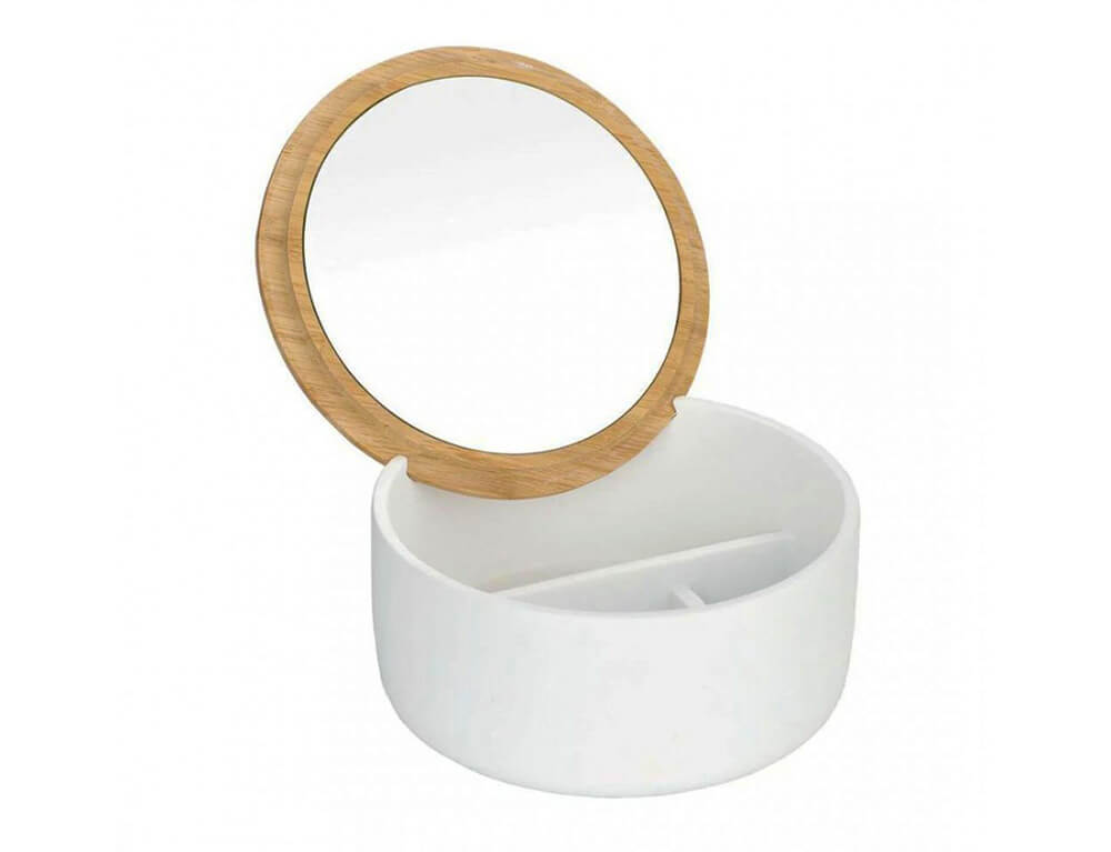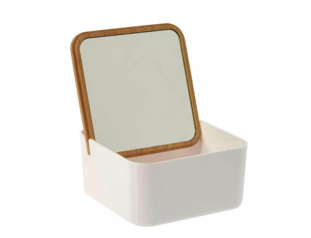 Οργανώστε τα είδη περιποίησης ή τα κοσμήματά σας με το κουτί οργάνωσης της εταιρείας Excellent Houseware. Ένα απλό και κομψό organizer καλλυντικών ή κοσμημάτων που θα κοσμεί υπέροχα το μπάνιο ή το δωμάτιό σας. Στο καπάκι του διαθέτει καθρέφτη, o oποίος στηρίζεται σε εσοχές για να σας διευκολύνει περισσότερο στη χρήση, αφού μπορείτε να το πάρετε μαζί σας όπου θέλετε. Eίναι κατασκευασμένο από πλαστικό σε λευκό χρώμα με καπάκι από bamboo και εσωτερικό καθρέφτη και ταιριάζει σε κάθε είδος διακόσμησης.