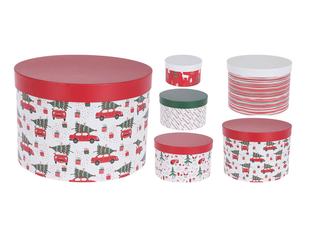 Χριστουγεννιάτικα κουτιά αποθήκευσης σετ 5 τεμαχίων με χριστουγεννιάτικες παραστάσεις. Είναι στρογγυλά, κατασκευασμένα από χαρτόνι σε λευκό, κόκκινο και πράσινο χρώμα. Αποτελούν ιδανική λύση για να τακτοποιήσετε μικροπράγματα ή να τα χρησιμοποιήσετε ως πρωτότυπη συσκευασία δώρου κατά την εορταστική περίοδο.