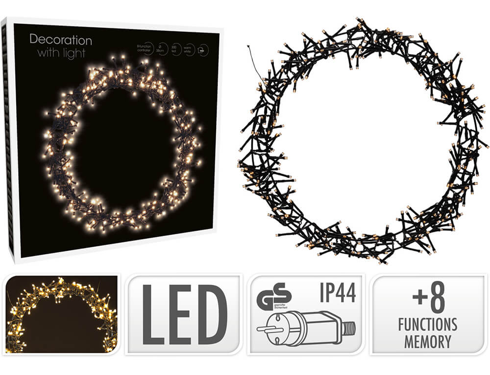 Στεφάνι με 300 φωτάκια LED - 3 Μέτρα σύνδεσης , Kανονική Διάταξη, με χειριστήριο, 8 προγράμματα, Μαύρο καλώδιο PVC και διάμετρο 38cm - Θερμό Λευκό