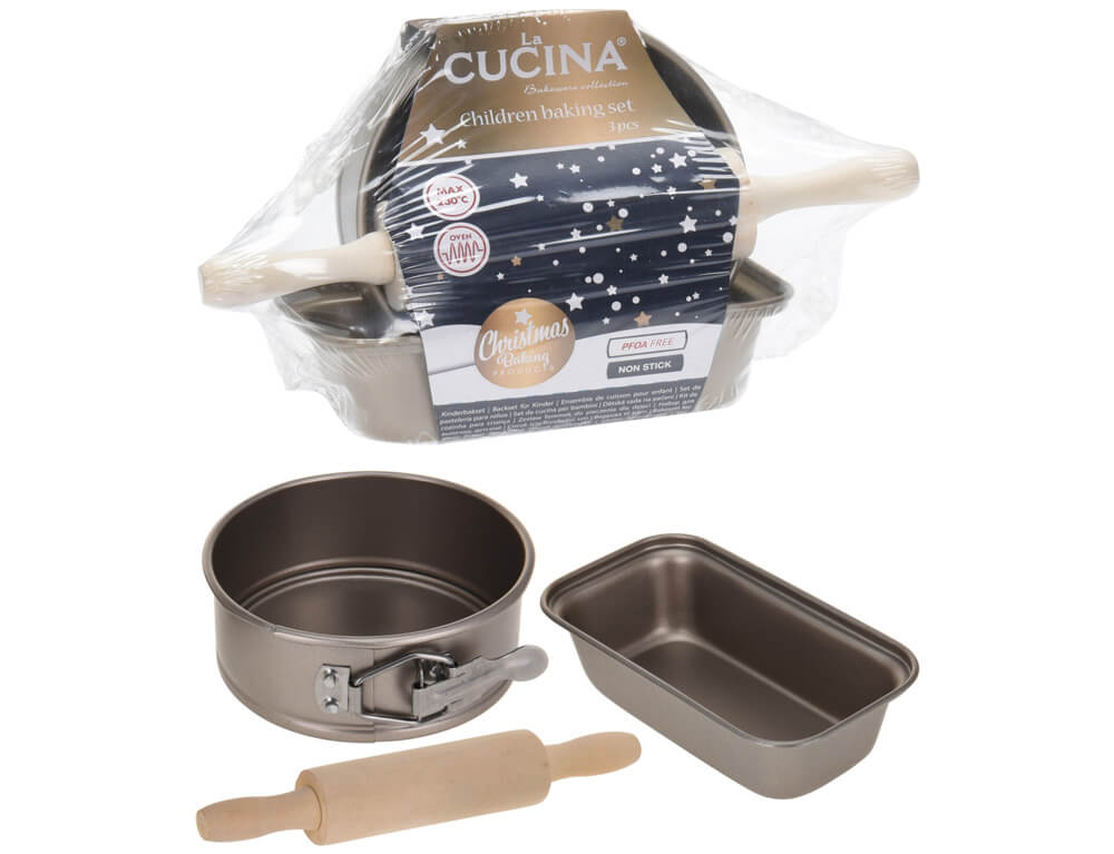 Ένα χαριτωμένο μικρό σετ ψησίματος 3 τεμαχίων για παιδιά, που αποτελείται από πλάστη και δύο ταψιά. Κατάλληλο για φούρνο (μέγ. 230 βαθμοί) και χωρίς PFOA. Κατασκευασμένο από ξύλο και αλουμίνιο.