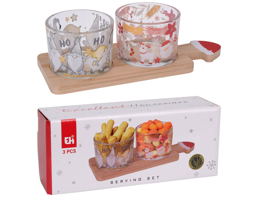 Σερβίρετε τις αγαπημένες σας δημιουργίες και δώστε την τέλεια εικόνα σερβιρίσματος με το χριστουγεννιάτικο σετ σερβιρίσματος Excellent Houseware που αποτελείται από 2 μπολ και ξύλινο δίσκο.
