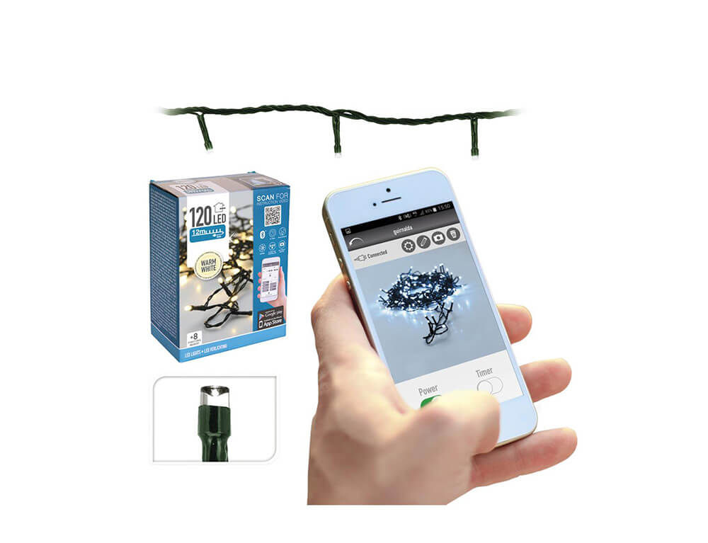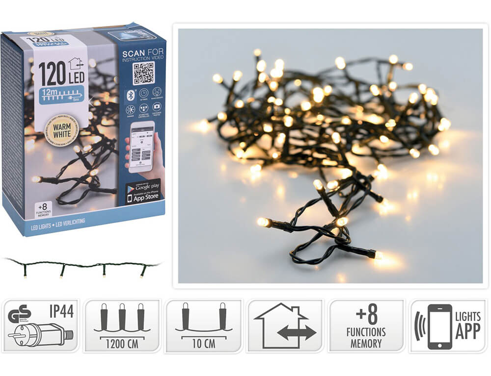 120 Φωτάκια LED - 12 Μέτρα + 5 Μέτρα σύνδεσης (AX8718500), Κανονική Διάταξη, με Bluetooth, 8 προγράμματα, Πράσινο καλώδιο PVC - Με Dimmer Και Έλεγχο μέσω Κινητού Τηλεφώνου - Θερμό λευκό