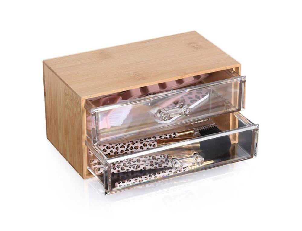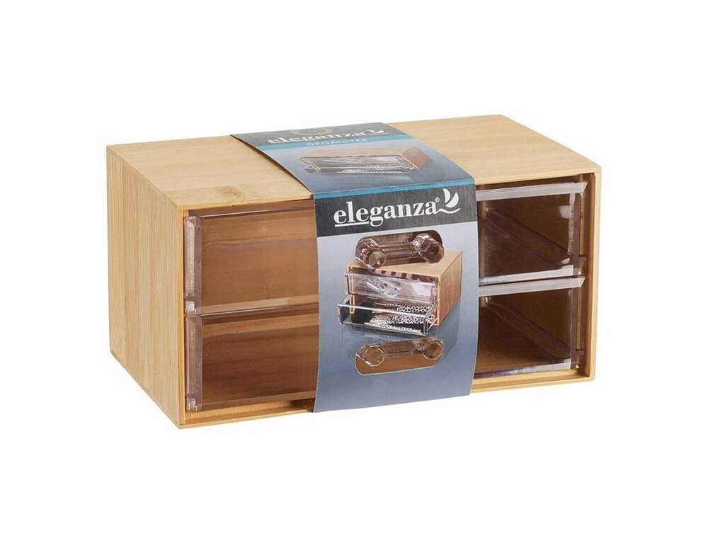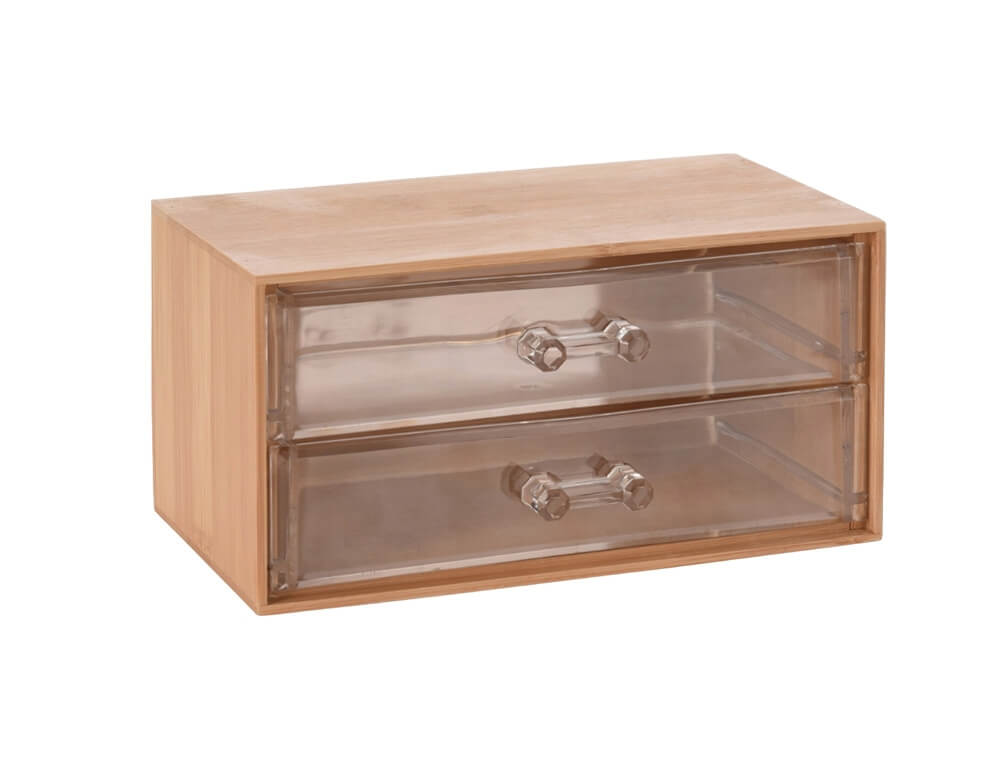 Οργανώστε το χώρο σας με τη συρταριέρα από την Eleganza. Είναι κατασκευασμένη από ξύλο μπαμπού, ένα ανθεκτικό υλικό και ταιριάζει σε κάθε είδος διακόσμησης. Διαθέτει 2 συρτάρια και είναι ιδανική για να οργανώσετε τα πινέλα, αξεσουάρ περιποίησης ή τα καλλυντικά που χρησιμοποιείτε περισσότερο. Τα συρτάρια είναι διάφανα για να βλέπετε εύκολα το περιεχόμενό τους.