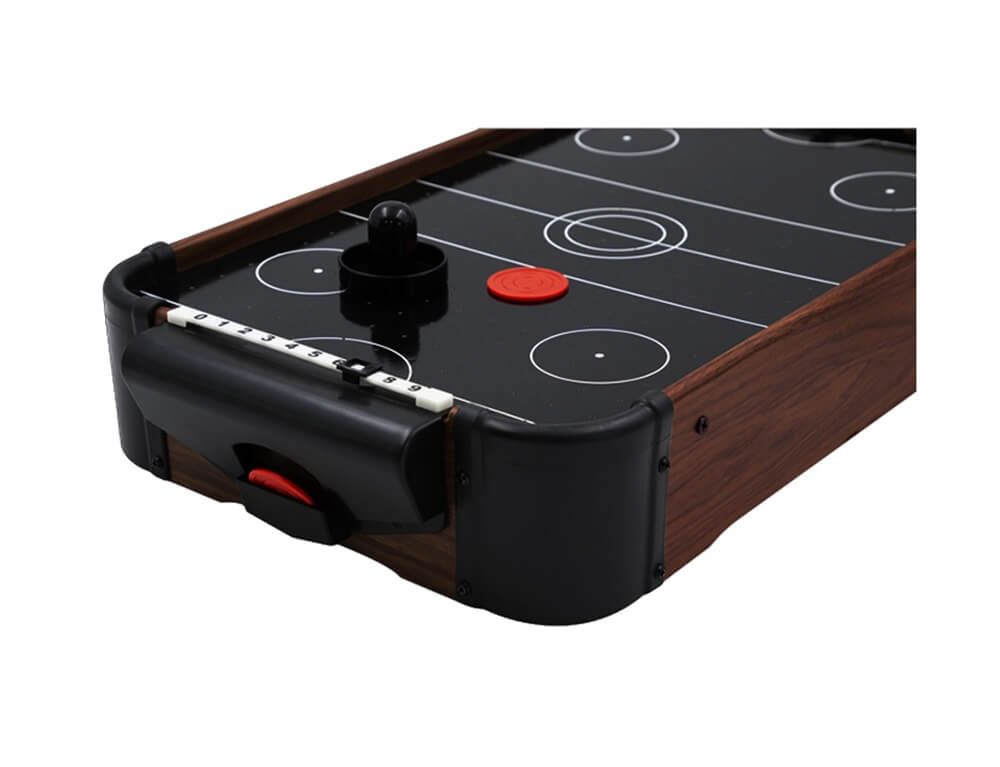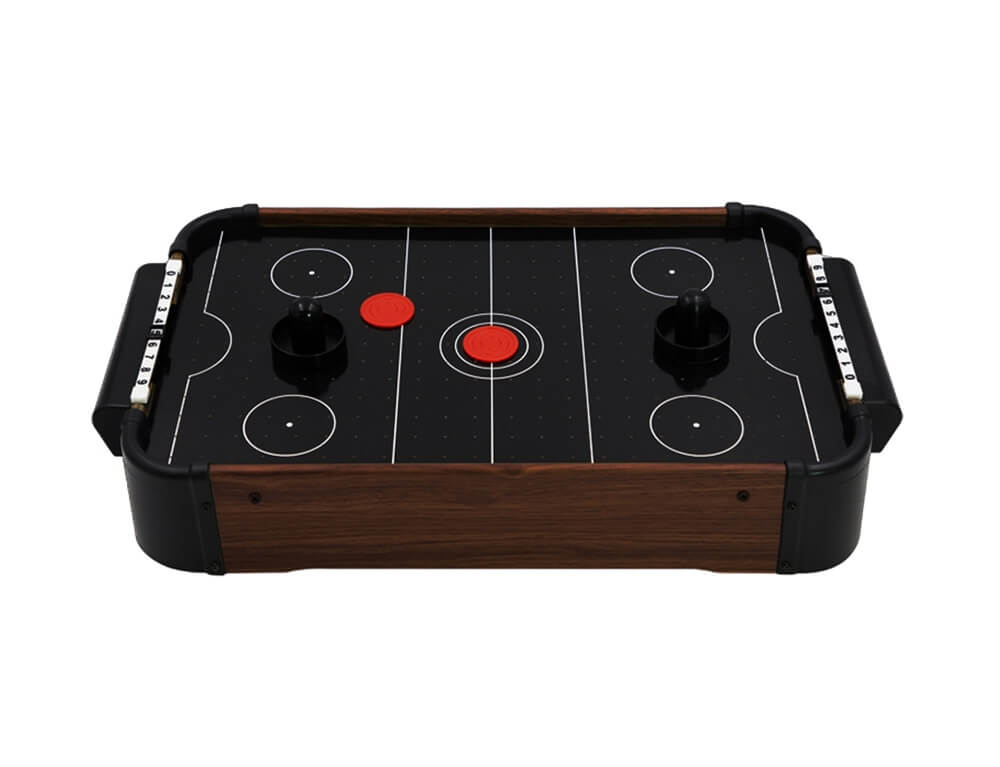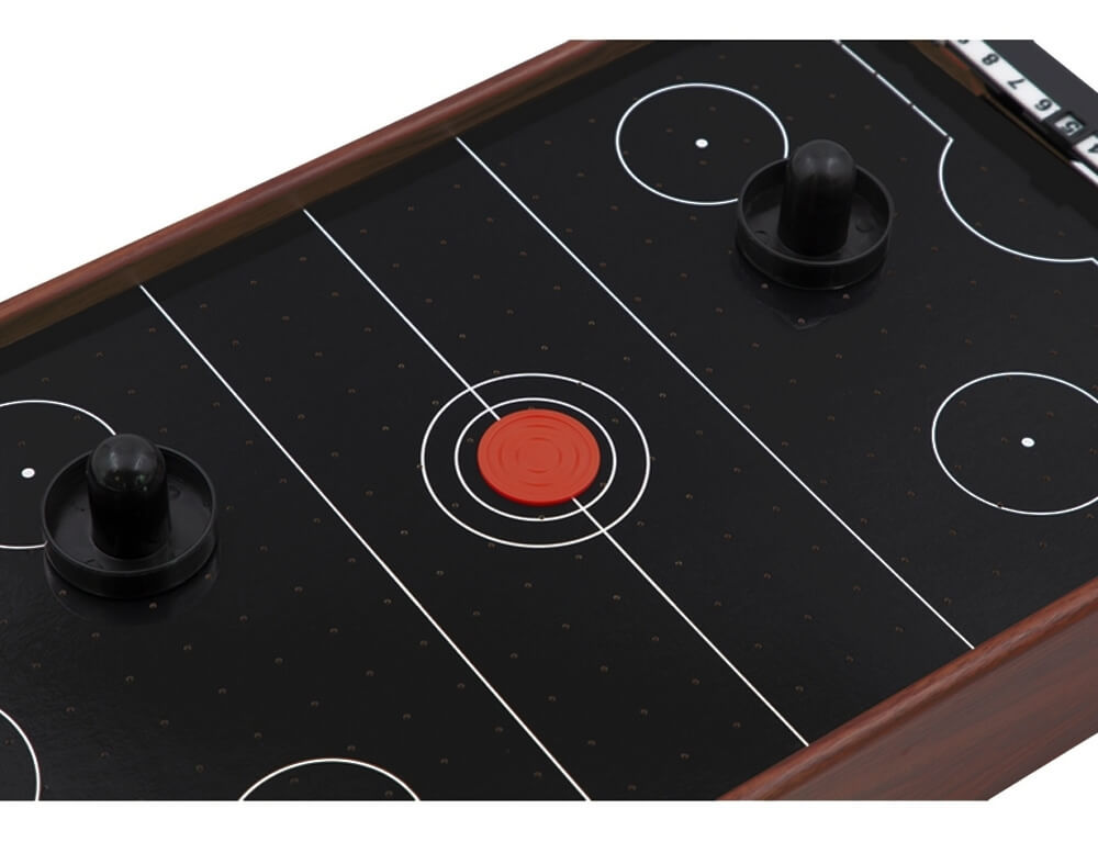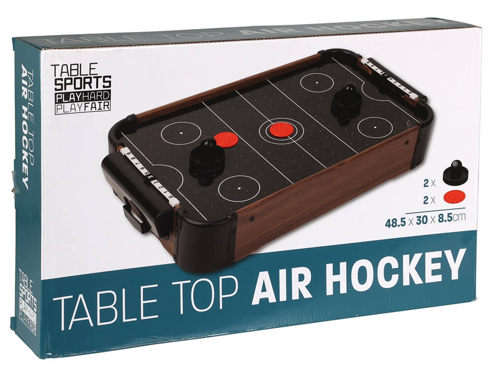 Το επιτραπέζιο Air Hockey είναι απαραίτητο για τους λάτρεις του Air Hockey που δεν έχουν αρκετό χώρο για ένα τραπέζι πλήρους μεγέθους. Μπορεί να τοποθετηθεί σε οποιοδήποτε κανονικό τραπέζι και τα παιχνίδια μπορούν να ξεκινήσουν! Το επιτραπέζιο Air Hockey είναι κατασκευασμένο από MDF ξύλο και πλαστικό. Λειτουργεί με 3 μπαταρίες ΑΑ για τη δημιουργία αέρα και διαθέτει δύο αναλογικούς μετρητές του σκορ, έναν πίσω από κάθε τέρμα. Όταν δεν χρησιμοποιείται, μπορείτε να το αποθηκεύσετε σε μια γωνία για να μην πιάνει πολύ χώρο. Στη συσκευασία περιλαμβάνονται δύο δίσκοι και δύο λαβές.